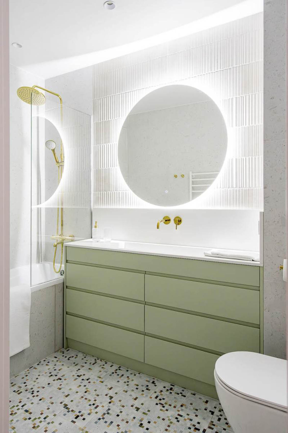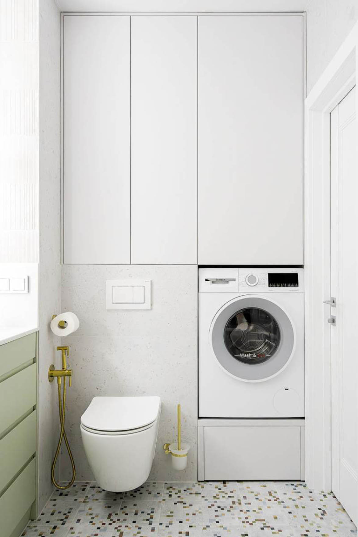 A fürdőszoba stílusos és funkcionális. A tartófalak és szellőzőaknák által behatárolt teret a lakberendező maximálisan kihasználta. Egyedi beépített szekrény rejti a mosógépet, a szennyeskosarat és a tárolóhelyeket, egységes és rendezett felületet hozva létre. A friss, világoszöld színnel és a terrazzo hatású padlólappal a helyiség saját karaktert kapott. A nagyméretű, háttérvilágítással ellátott kerek tükör nemcsak praktikus, de a mögötte felrakott csempe felületét kiemelve látványelem is.