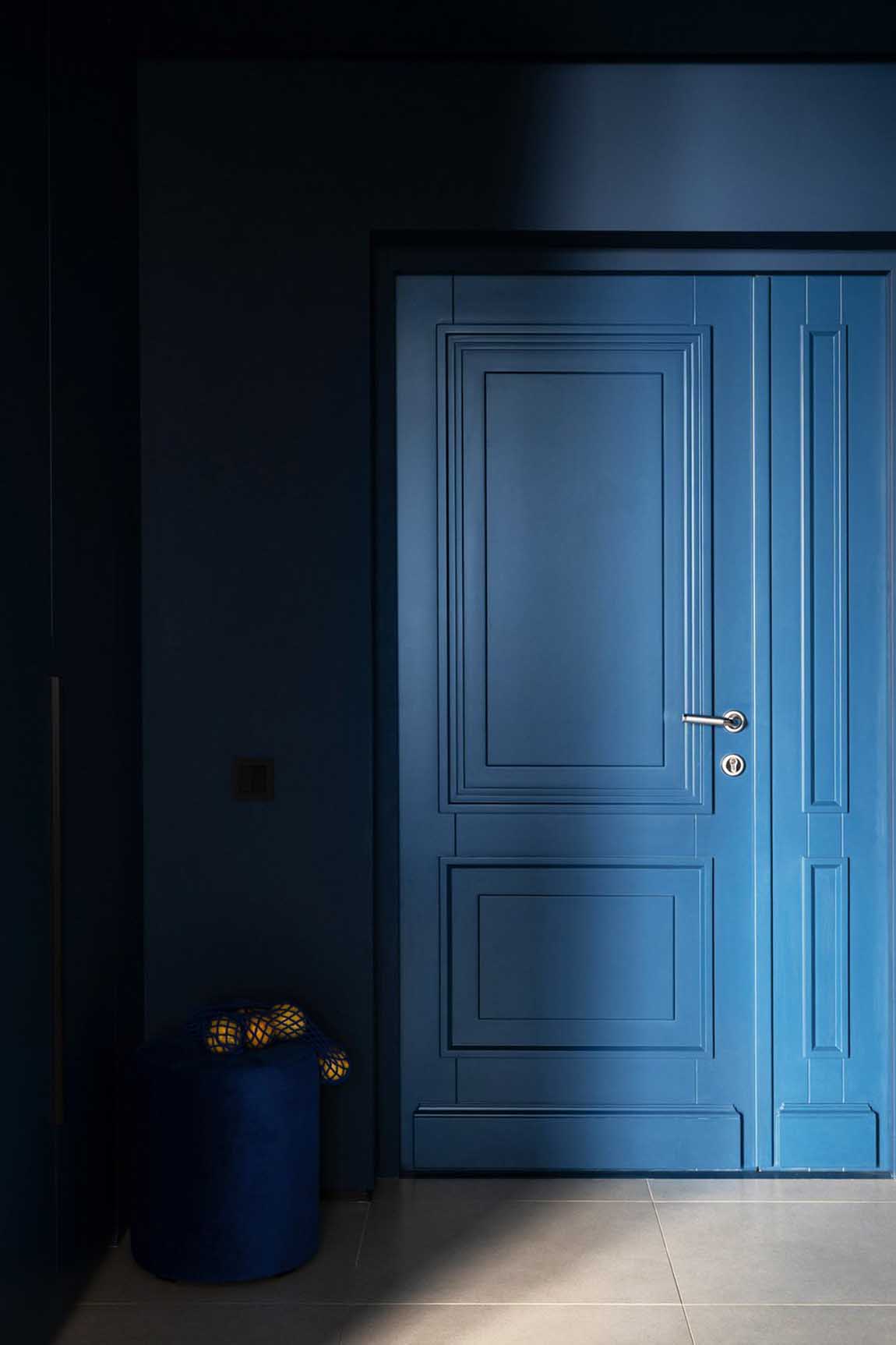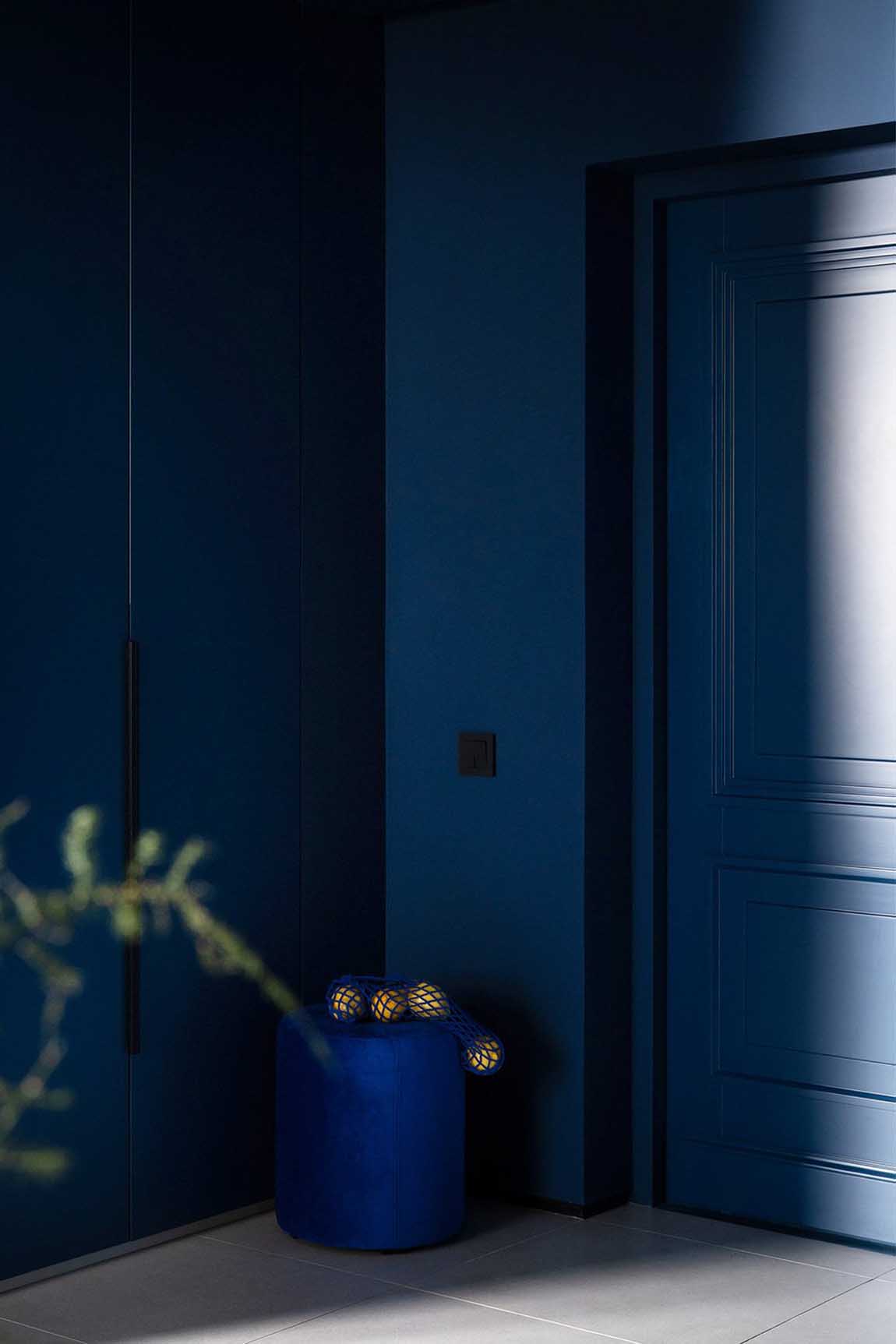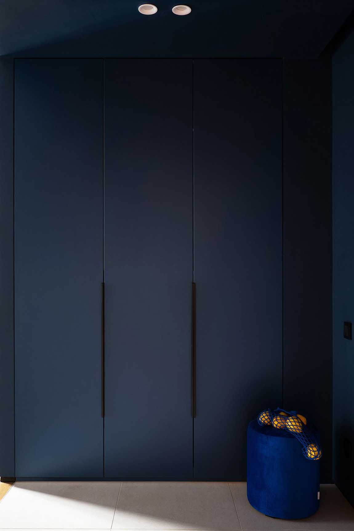 A teljes egészében mélykék előtérben egy egyedi tervezésű, két oldalról is nyitható gardróbszekrényt alakítottak ki, ez az elem finoman, mégis egyértelműen választja el a háló zónát az előtértől. A szekrény különlegessége, hogy tartalmához mindkét oldalról – a hálószobából és az előszobából is – hozzá lehet férni, ami rendkívül praktikussá teszi a tárolást és a pakolást.
