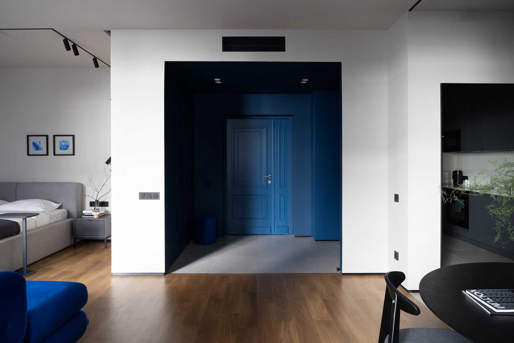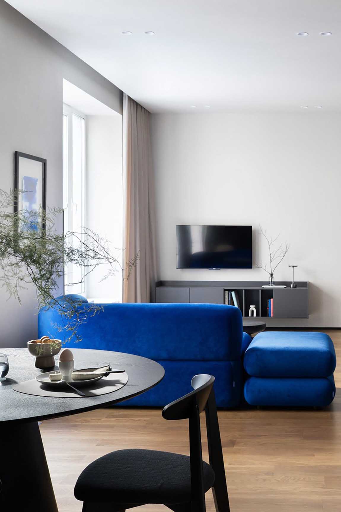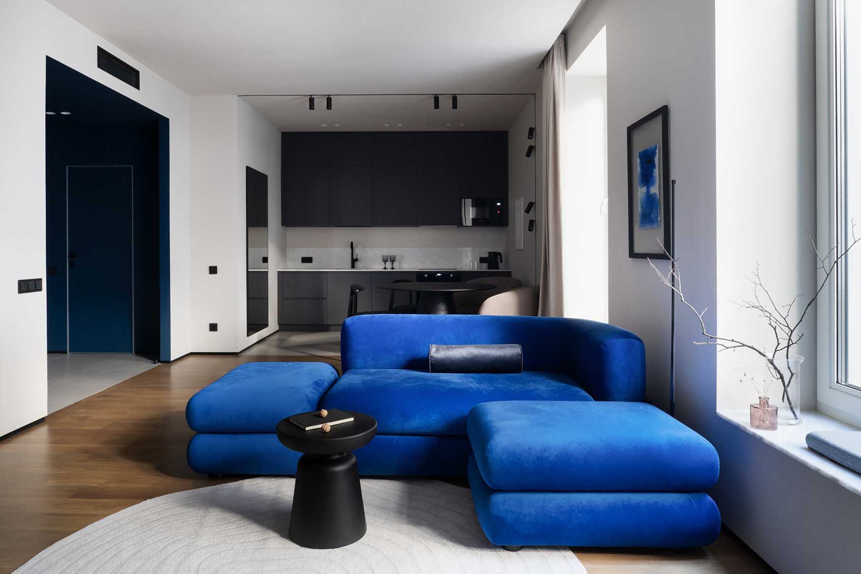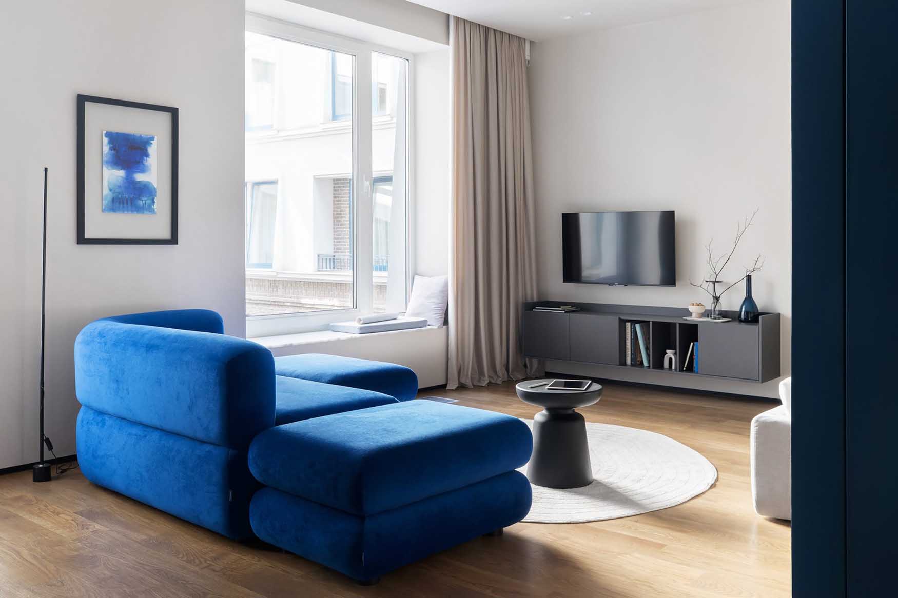 A 49 m²-es, új építésű lakásban a tervezési koncepció középpontjában egy olyan modern tér kialakítása állt, amely egyszerre látványos, mégis praktikus és élhető marad. Semleges, minimalista enteriőr megteremtése volt a cél, amelyet erőteljes kék színfoltok és a fény és az árnyékok játéka keltenek életre – első pillantásra is emlékezetessé téve a nyitott elrendezéssel kialakított életteret.