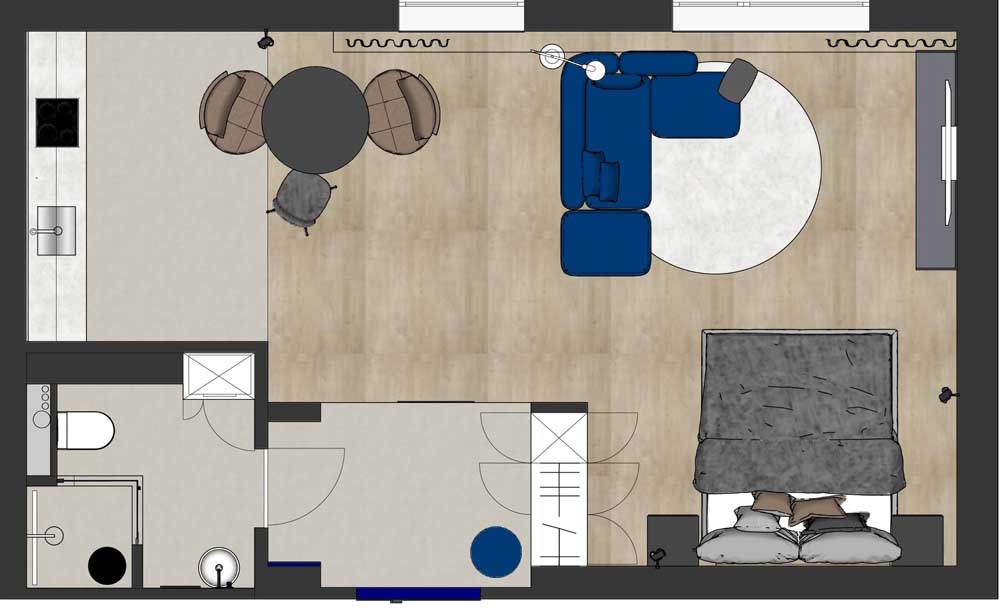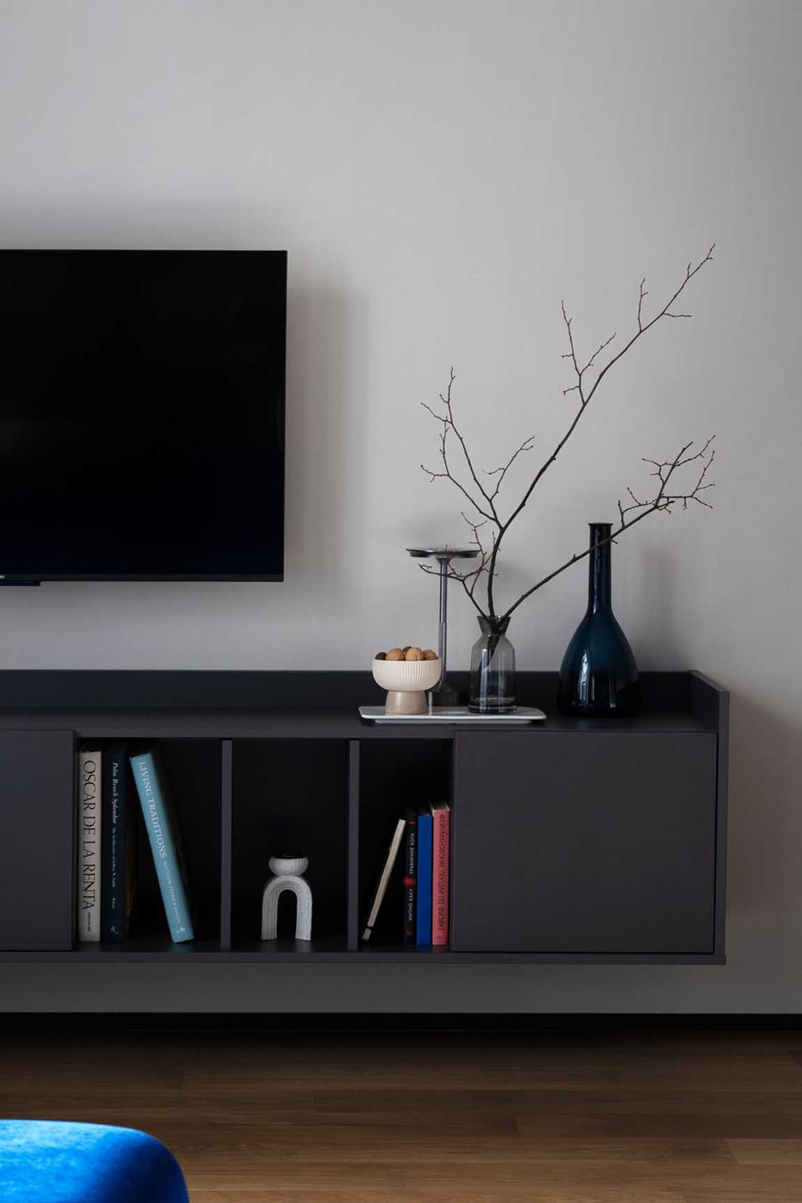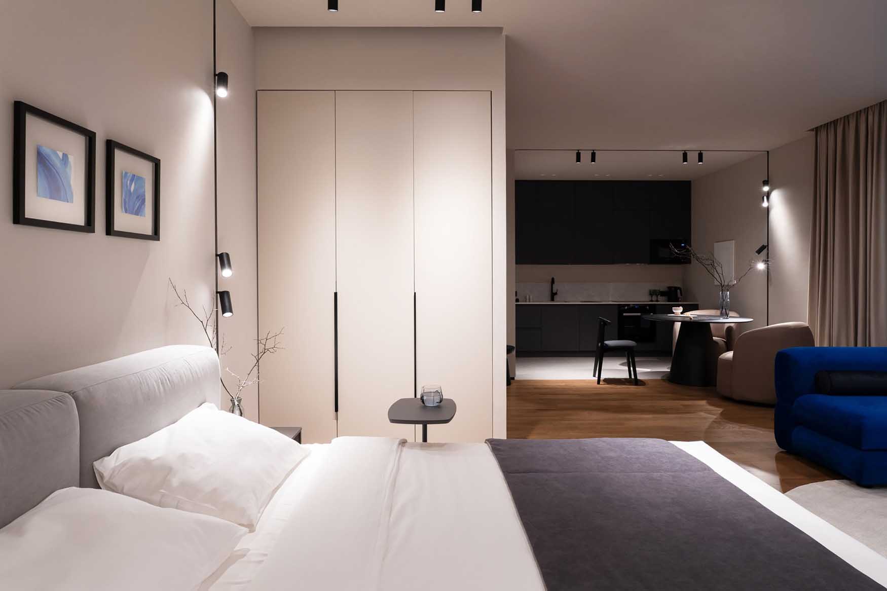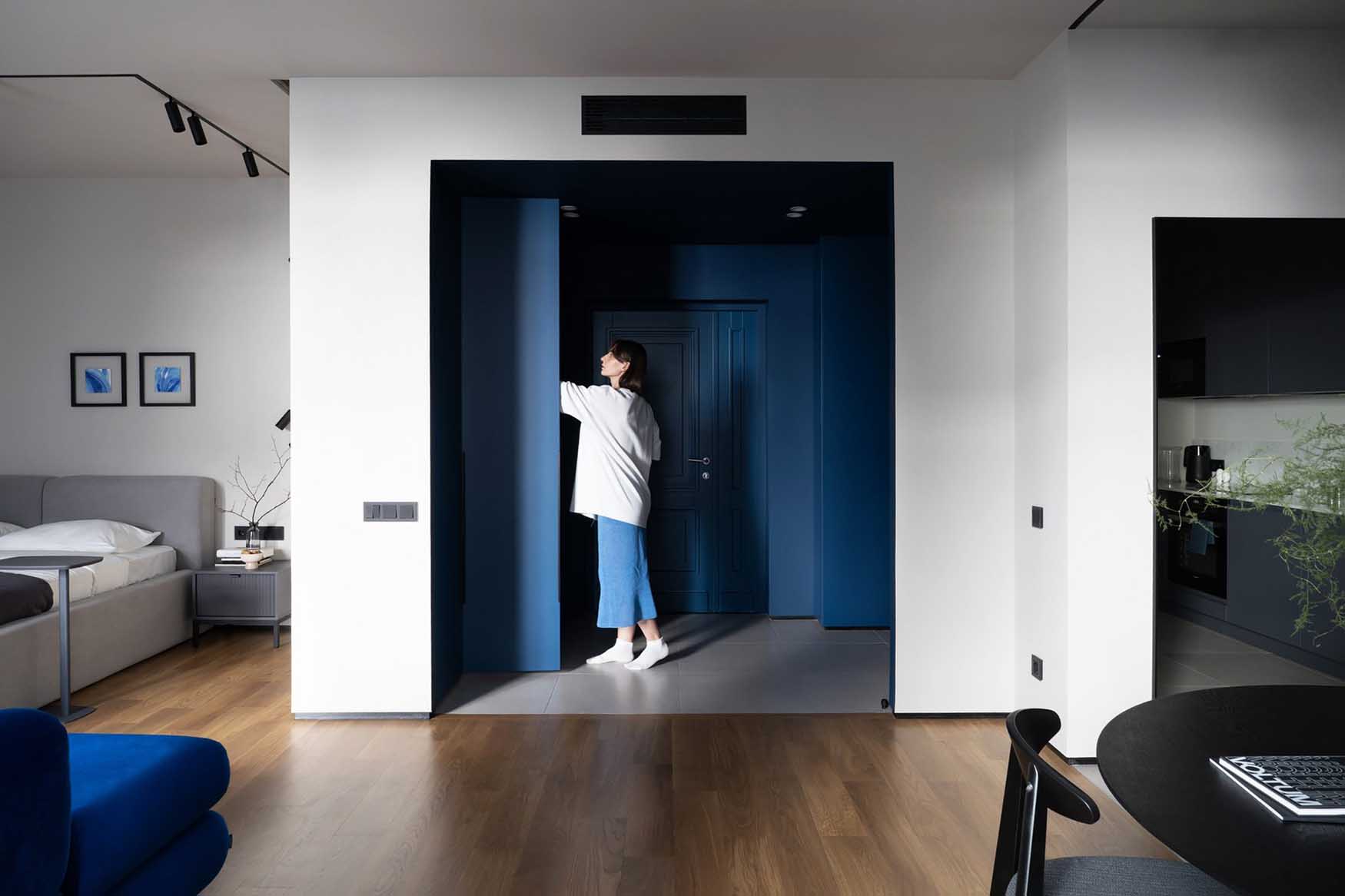 A 49 m²-es, új építésű lakásban a tervezési koncepció középpontjában egy olyan modern tér kialakítása állt, amely egyszerre látványos, mégis praktikus és élhető marad. Semleges, minimalista enteriőr megteremtése volt a cél, amelyet erőteljes kék színfoltok és a fény és az árnyékok játéka keltenek életre – első pillantásra is emlékezetessé téve a nyitott elrendezéssel kialakított életteret.