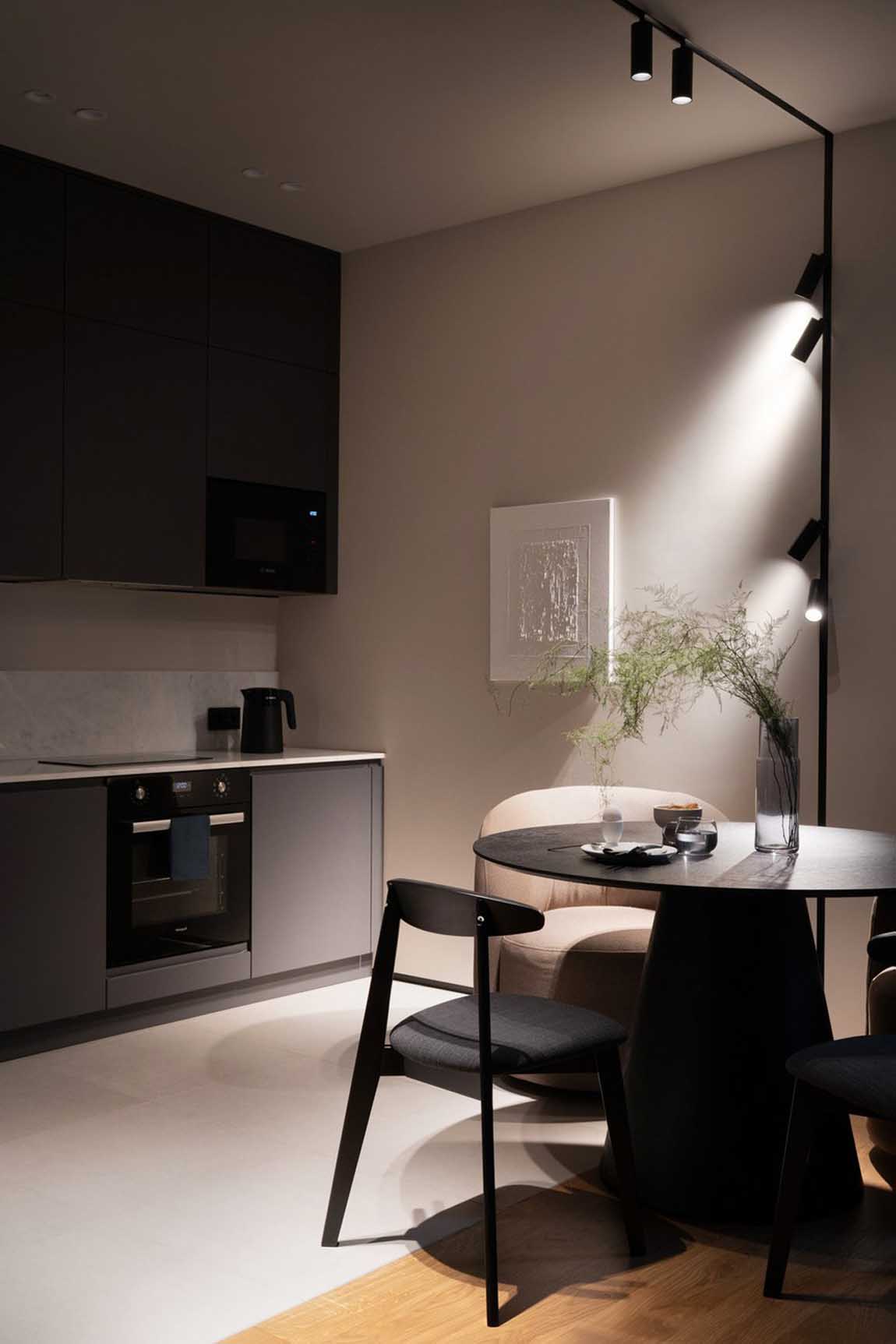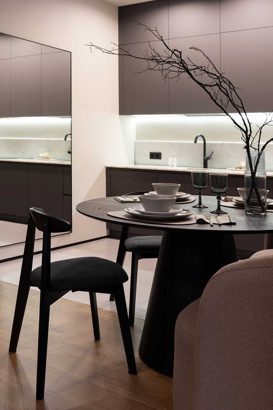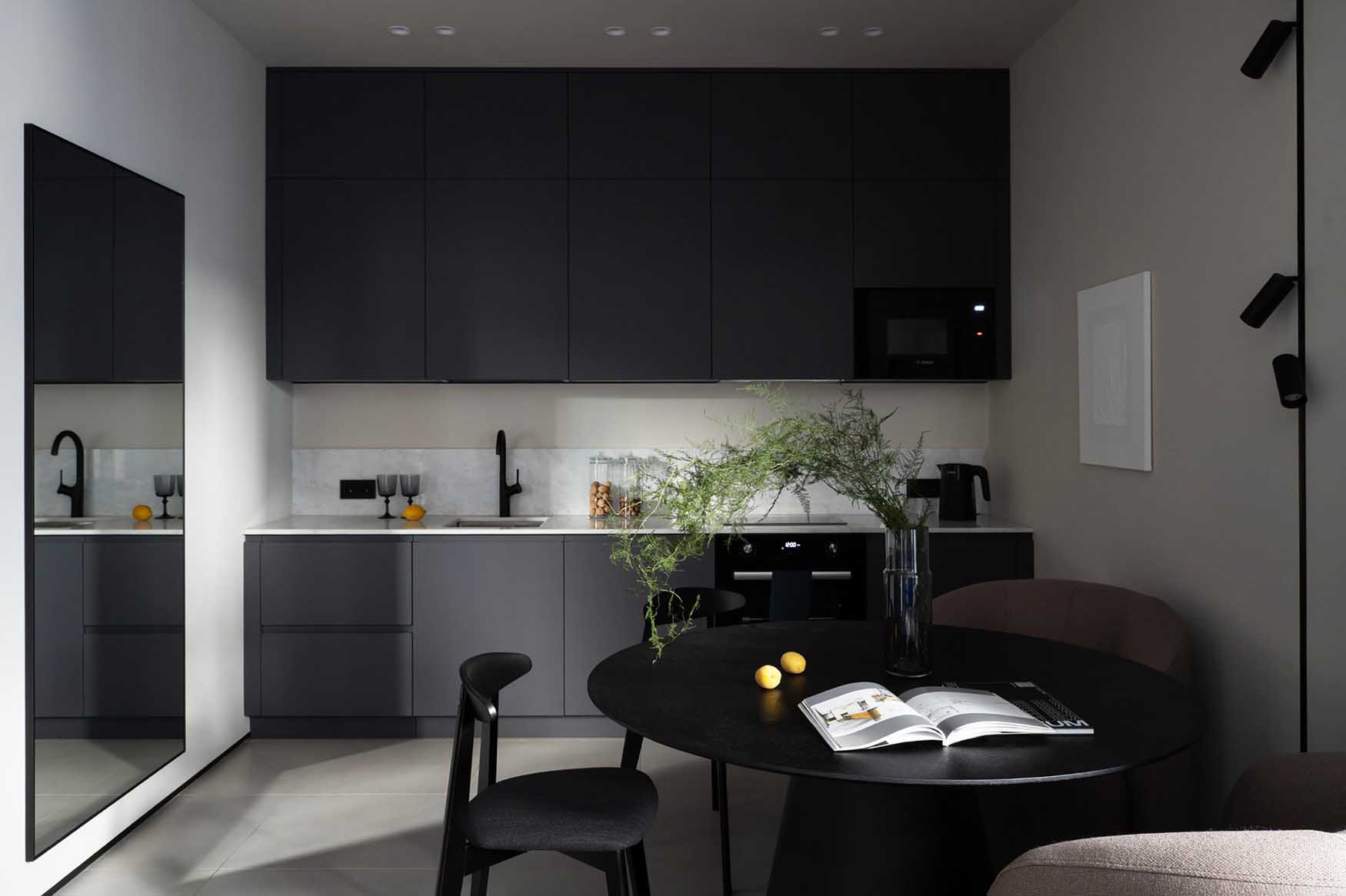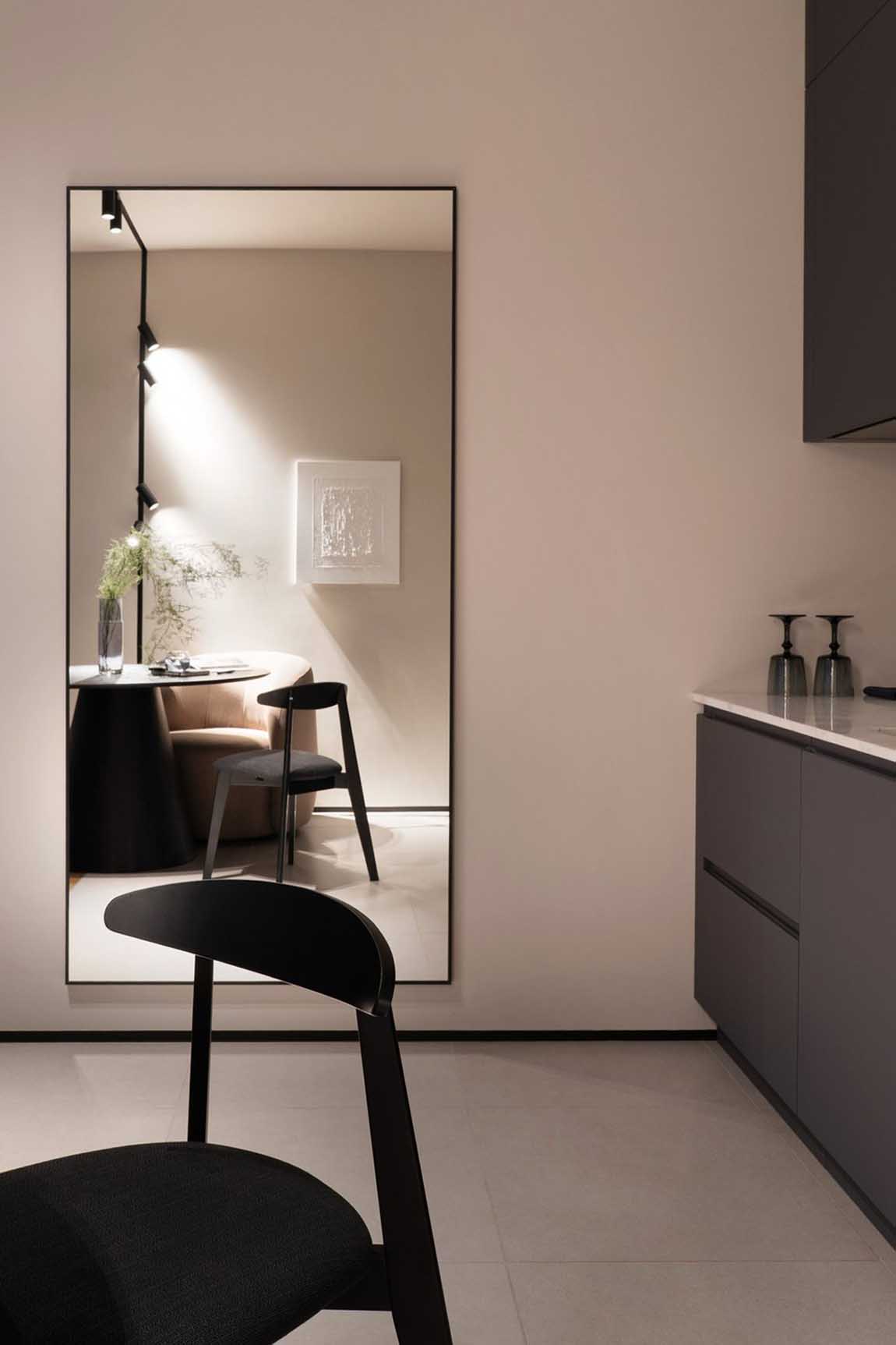 A minimalista szürke konyhabútor az egyik oldalfal mentén kapott helyet. Mivel a konyhai zónában nincs ablak és természetes fény, a tervezők egy nagyméretű tükröt helyeztek el a bútor melletti falon. Ez a megoldás nemcsak kompenzálja kissé az ablak hiányát, de hatékonyan veri vissza a másik zónából érkező fényt, ezzel is növelve a térérzetet.
