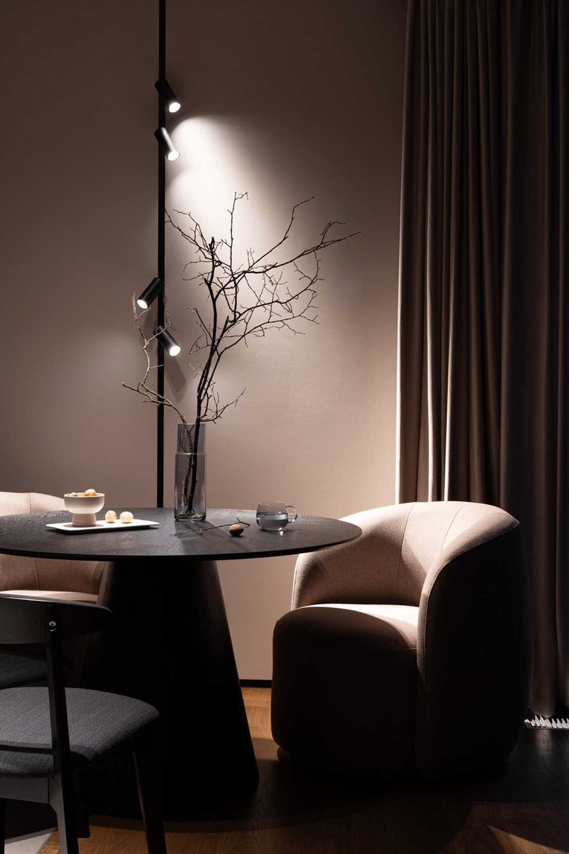 Az ingatlant a fürdőszoba leválasztásával, egyetlen összefüggő térként adták át. A tervezés során kihívást jelentett, hogy az ablakok egy belső udvarra néznek, északi tájolással, ami kevés természetes fényt jelentett. A fő feladat a fény és a tágasság érzetének maximalizálása volt, valamint a funkcionális zónák egyértelmű kijelölése. Fontos szempont volt, hogy mindezt térelválasztó falak építése nélkül, elsősorban a világítás, a bútorozás segítségével érjék el.