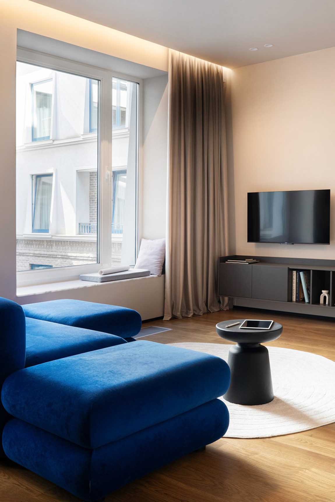 A nappali zónában a telített kék és a grafit árnyalatai dominálnak. A széles ablakpárkányok lehetőséget adtak pihenősarok kialakítására; ide puha matracok és párnák kerültek, hangulatos olvasóhelyet biztosítva. A sötétítő függönyök intelligens otthoni rendszeren keresztül, hangvezérléssel is működtethetők, tovább növelve a komfortérzetet.