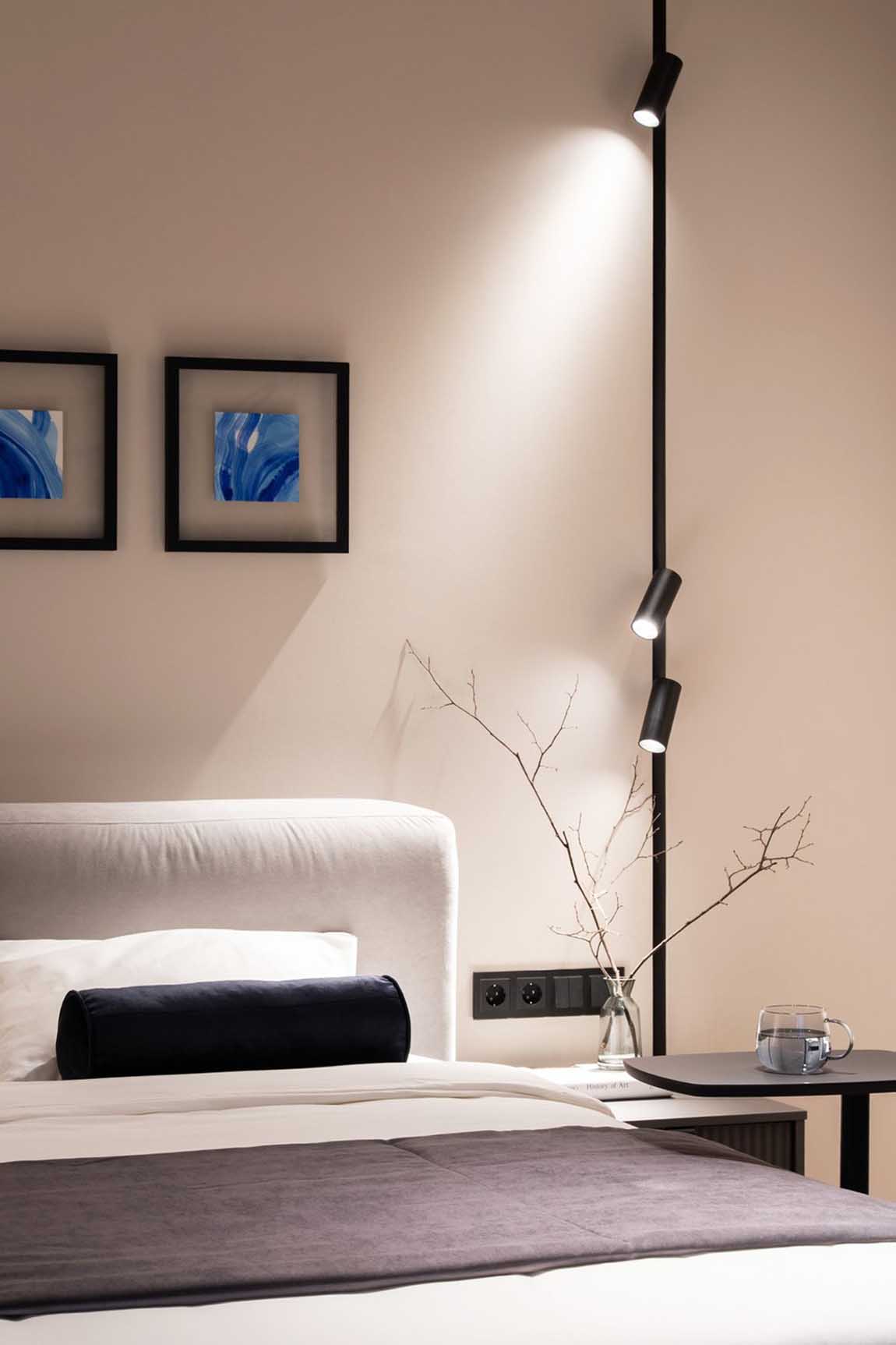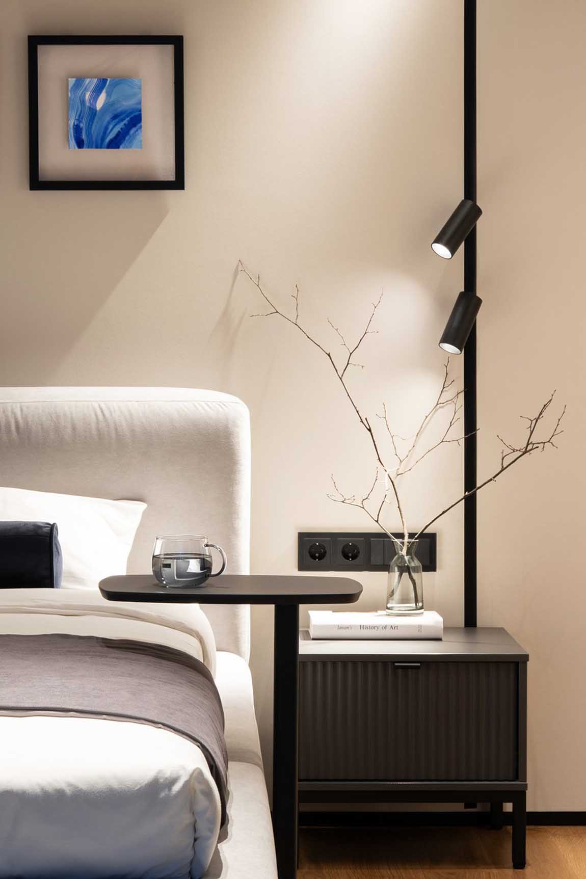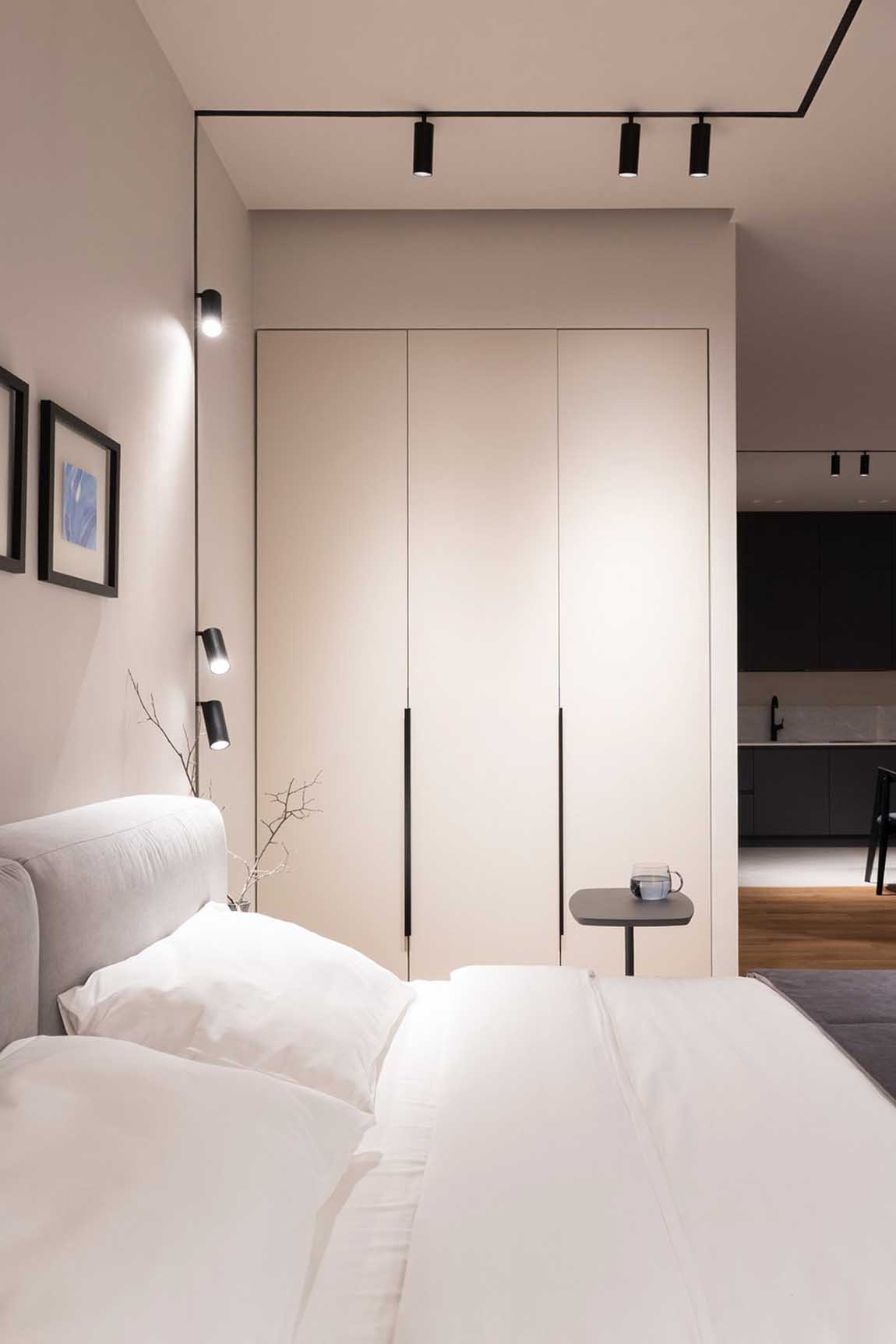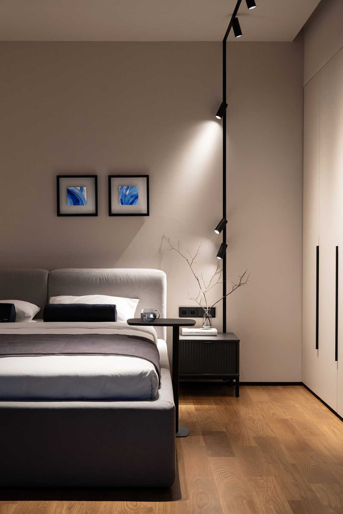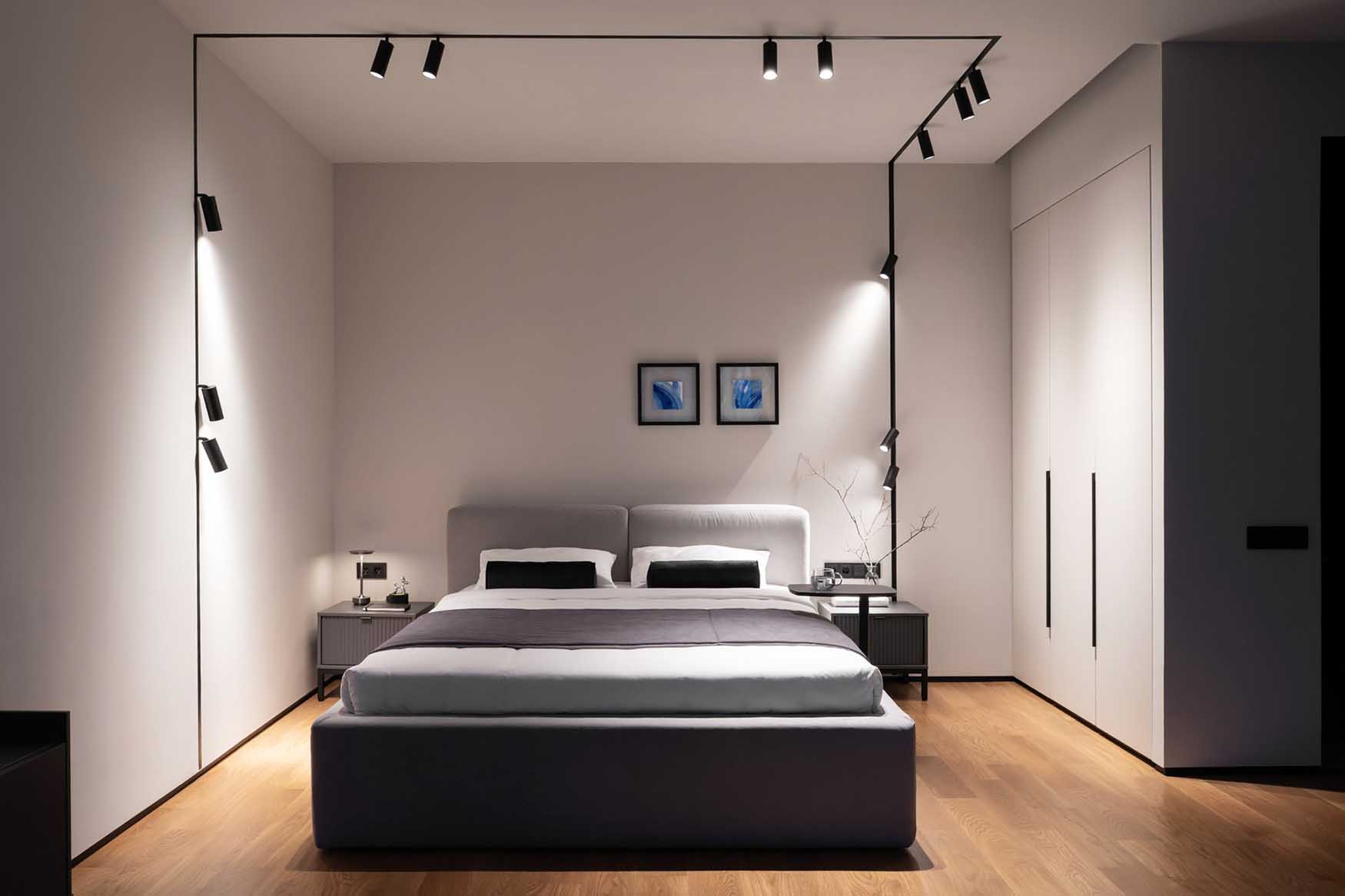 A háló zóna központi eleme a szürke velúr kárpitozású ágy. A lábak nélküli, széles, földig érő ágykeret tökéletesen illeszkedik a tér minimalista kontextusába. A funkcionális zónák elválasztását itt a világítással oldották meg: a teret sínrendszerbe épített, irányítható spotlámpák keretezik. A lámpák forgathatók, fényerejük pedig szabályozható, így a zónában könnyedén teremthető meg a kívánt hangulat, legyen szó olvasásról vagy relaxációról.