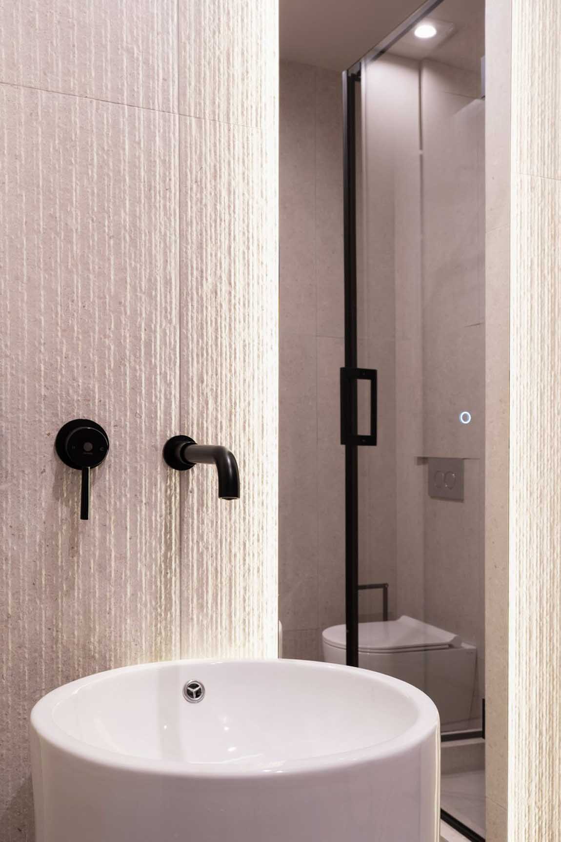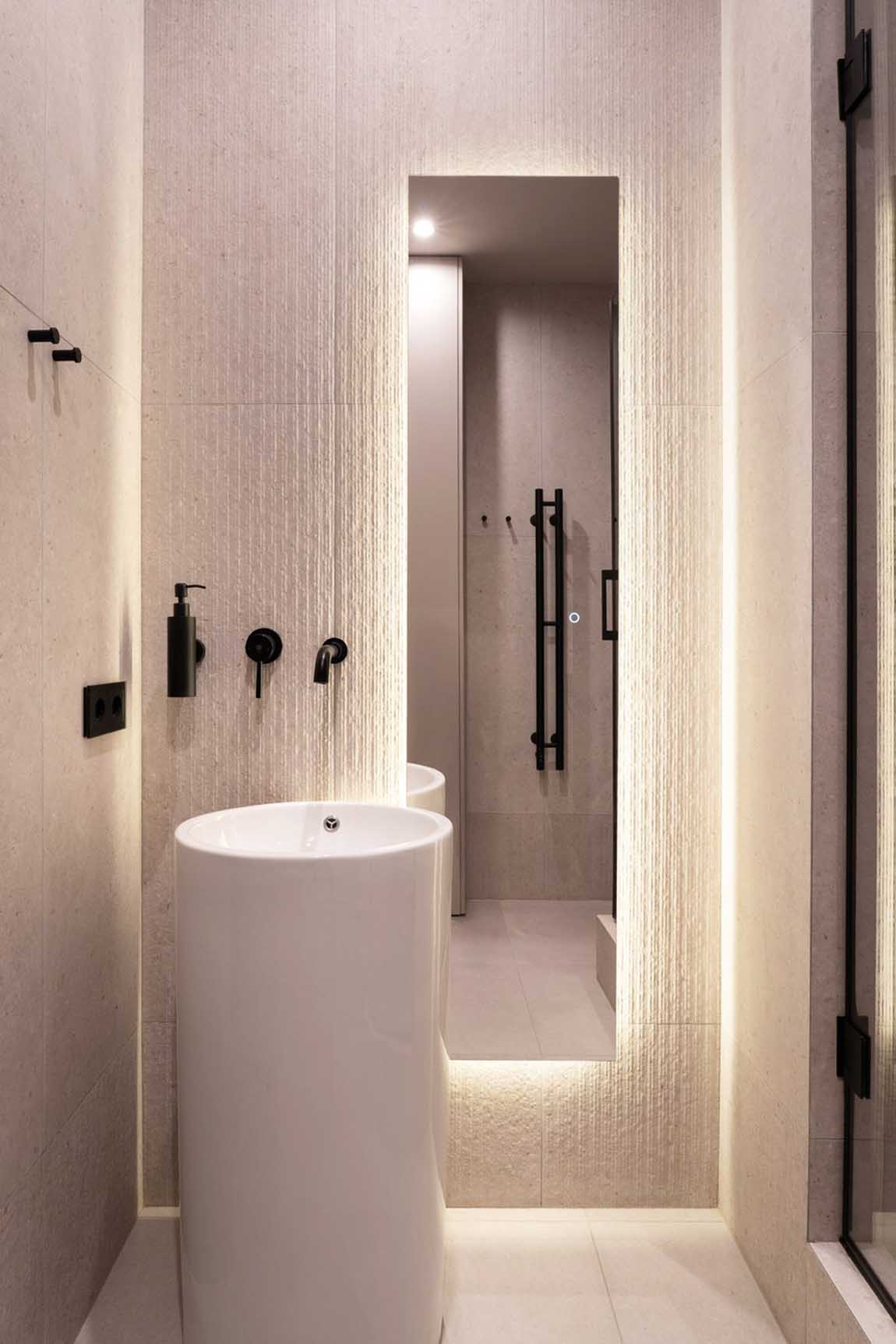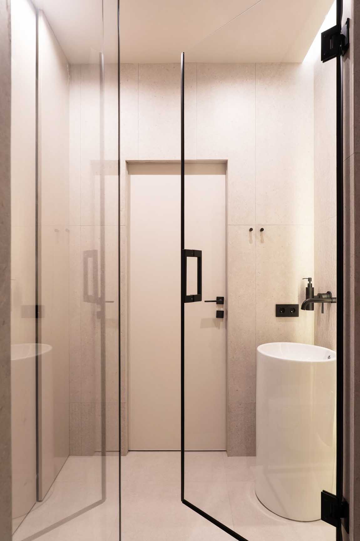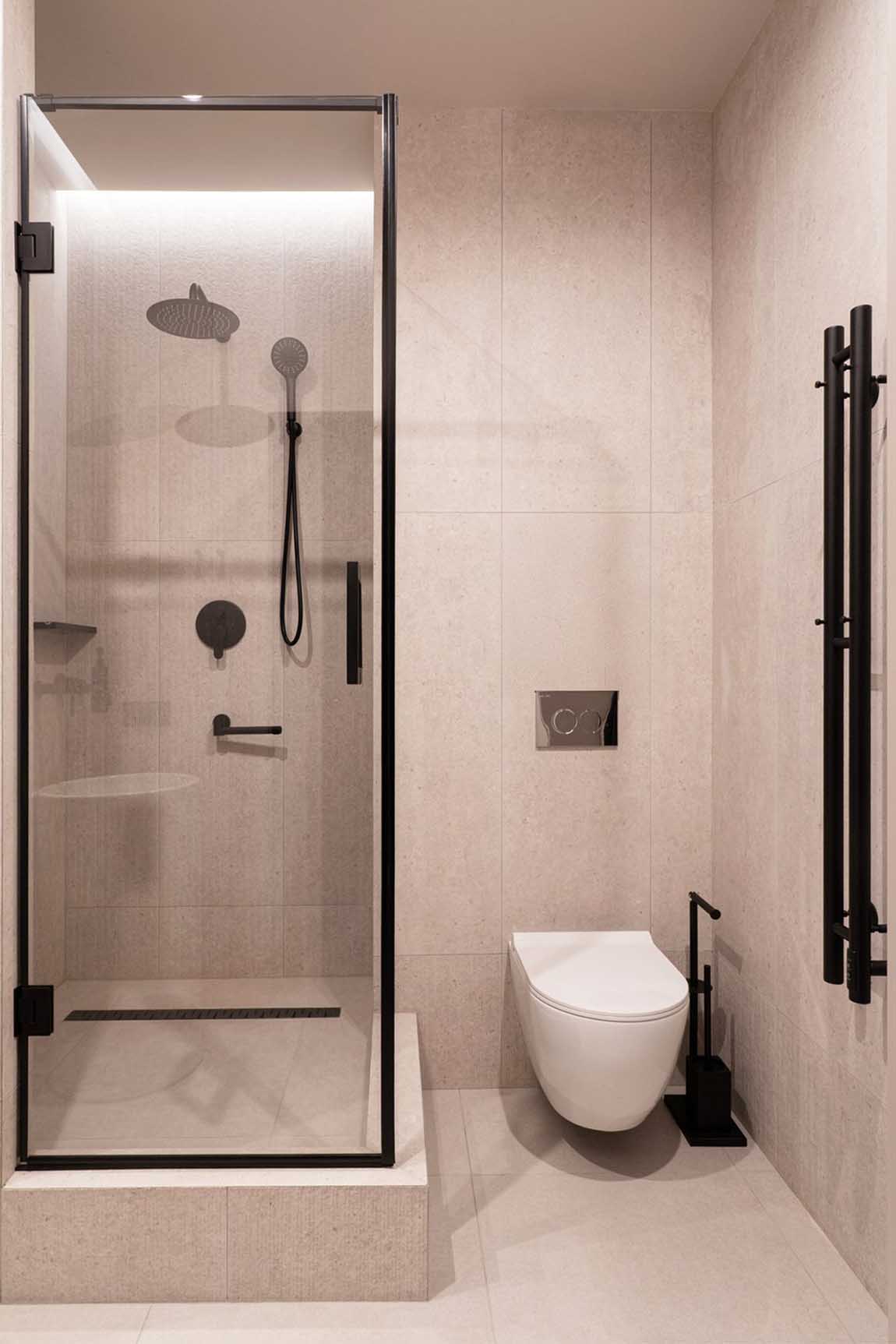 A fürdőszobát semleges bézs paletta jellemzi, amelyet fekete kiegészítők és csaptelepek tesznek hangsúlyossá és modernné. A tárolásról egy nagyméretű, padlótól mennyezetig érő beépített szekrény gondoskodik, amely diszkréten rejti el a mosógépet és biztosít bőséges tárolóhelyet a tisztítószereknek és textíliáknak. A zuhanykabin egyedileg, a helyiség pontos méreteihez igazodva készült el, maximalizálva a rendelkezésre álló teret.