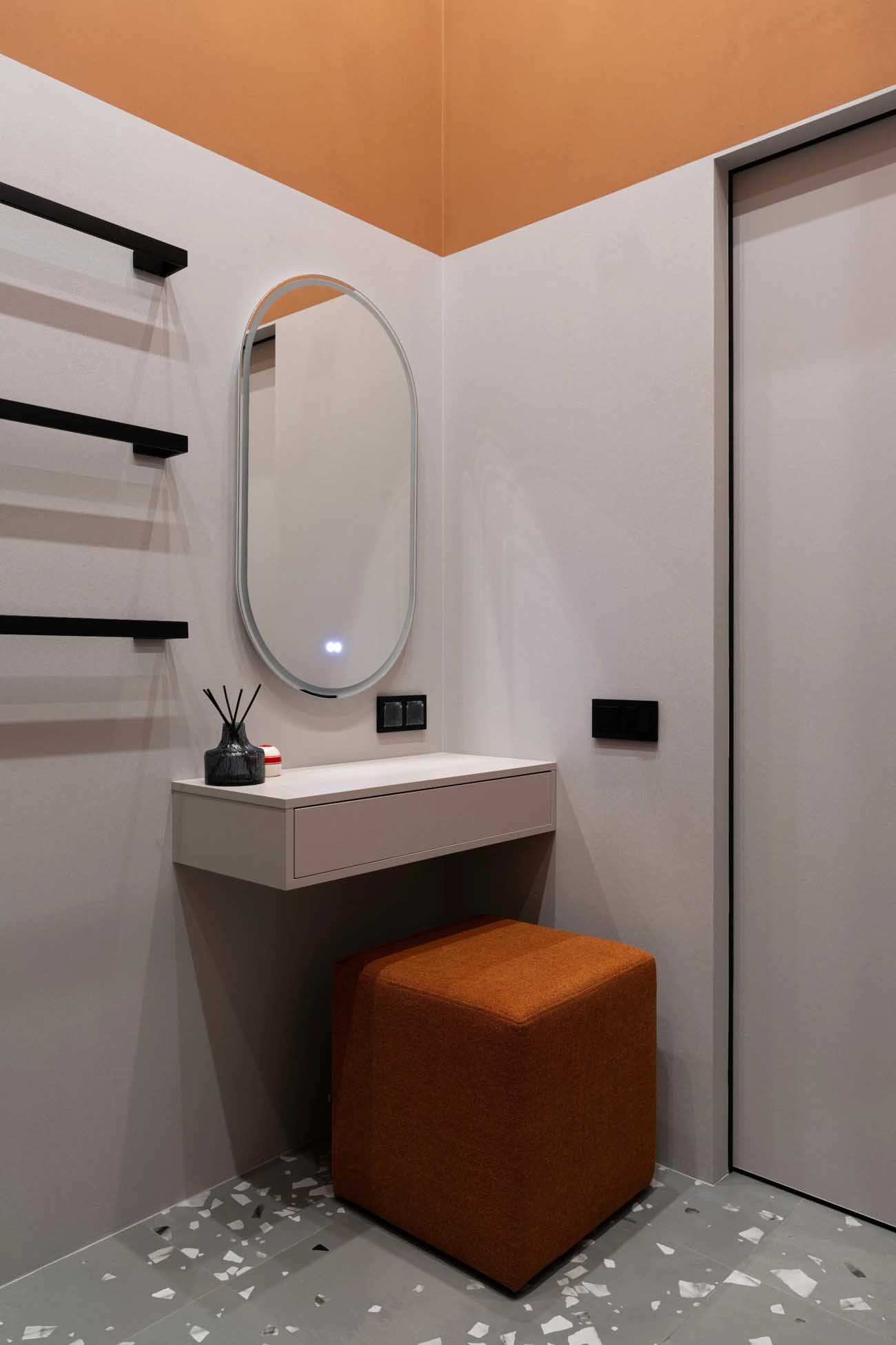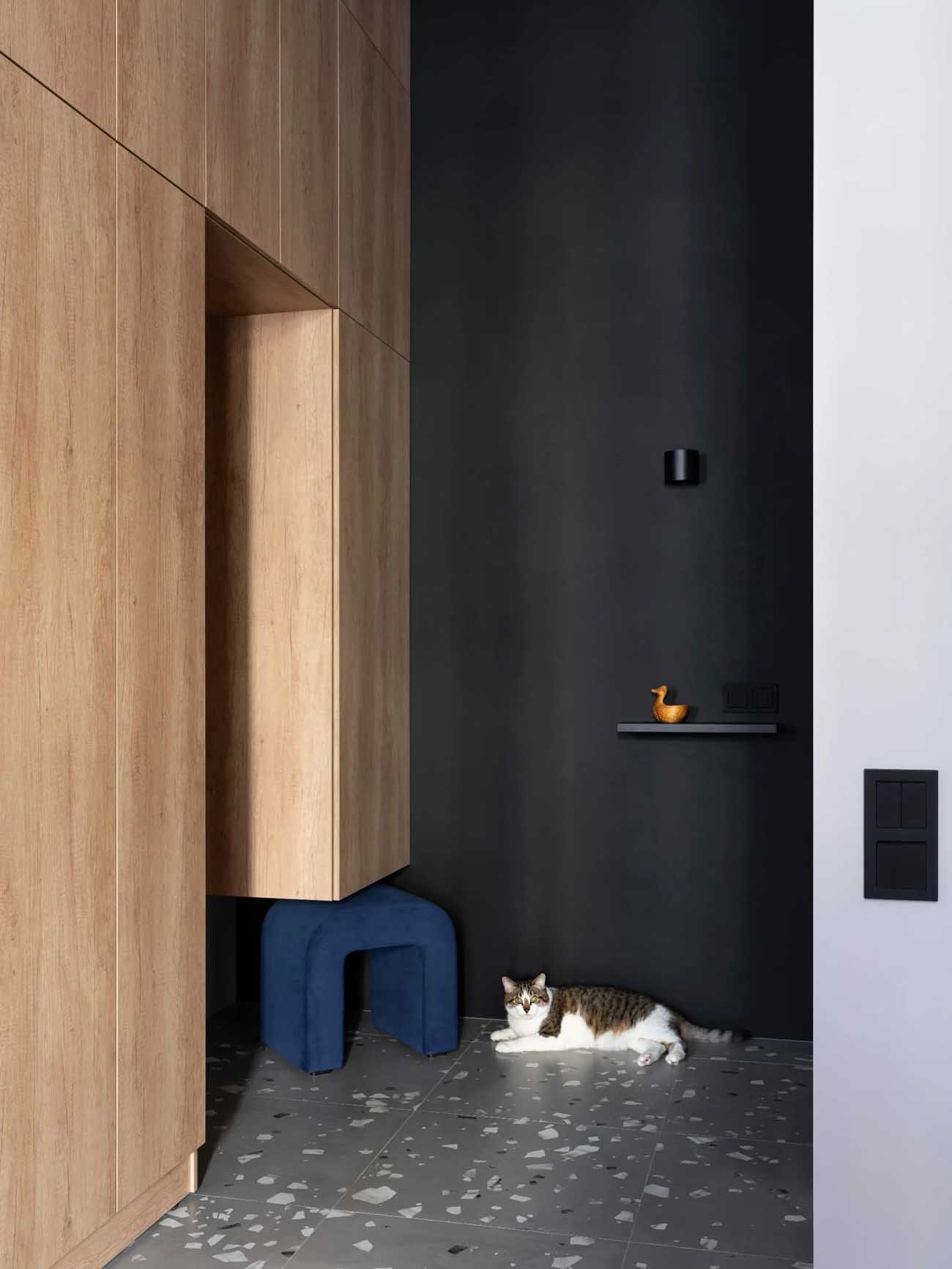 A beépített bútorok tervezésekor a “láthatatlanság” elve érvényesült: a laminált bútorlapok színeit úgy választották ki, hogy azok tökéletesen harmonizáljanak a falfelületek árnyalataival, így a nagy szekrények szinte beleolvadnak a térbe. A fürdőszobai fülkében kapott helyet a mosó- és szárítógép, alattuk pedig egy rejtett, a házi kedvenc számára kialakított búvóhely. A nagy belmagasság és a gondos tervezés lehetővé tette egy teljes értékű sminkasztal elhelyezését is a fürdőszobában.