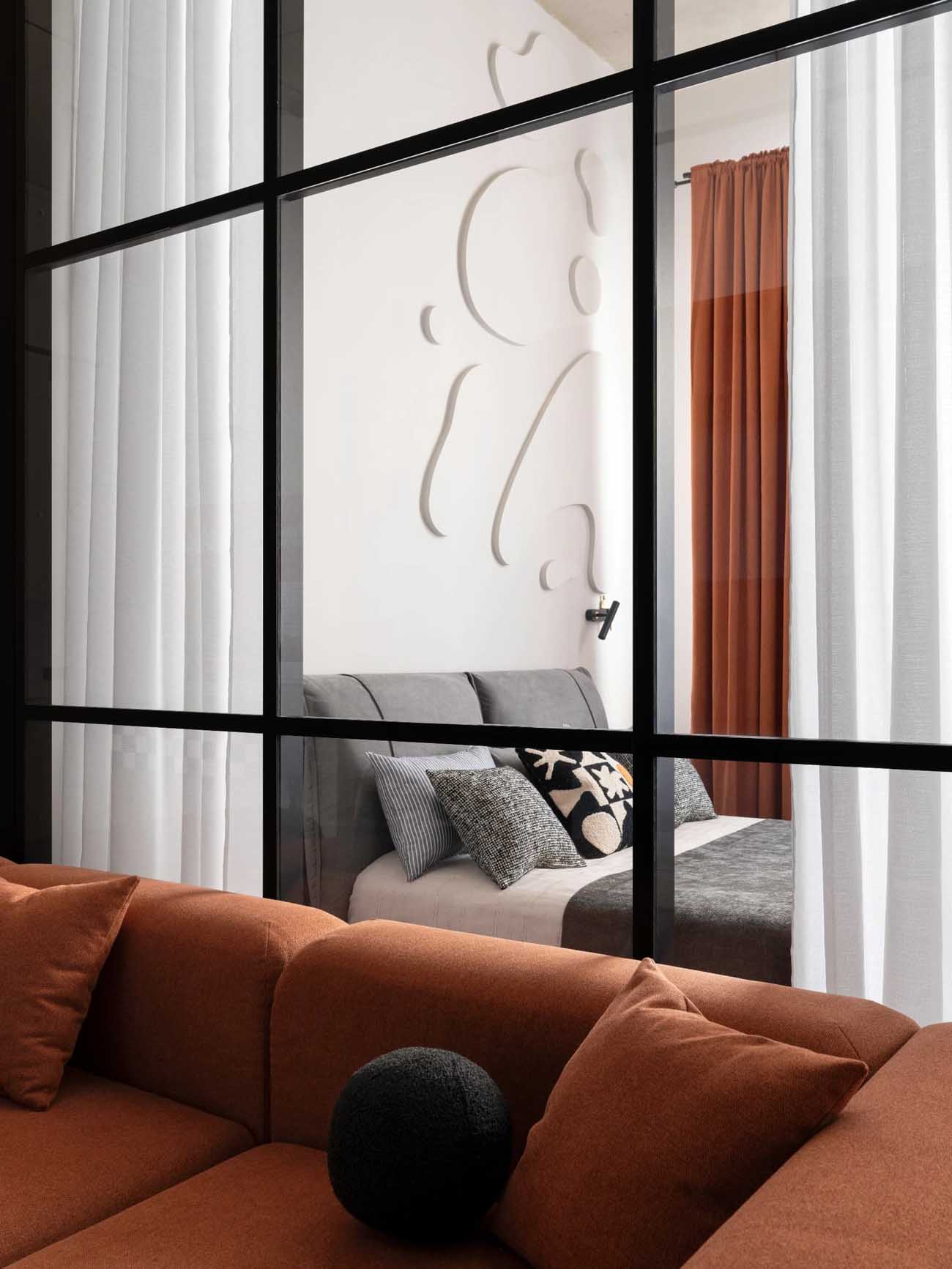 A természetes fény áramlását szem előtt tartva a lakóteret egy üveg térelválasztóval osztották két funkcionális egységre – ennek köszönhetően a hálószoba ablakán beáradó fény akadálytalanul jut el a nappaliba is. A nappali így egyszerre szolgál pihenőzónaként és dolgozószobaként, míg a konyha közelében egy elektromos zongora számára kialakított fülke kapott helyet.