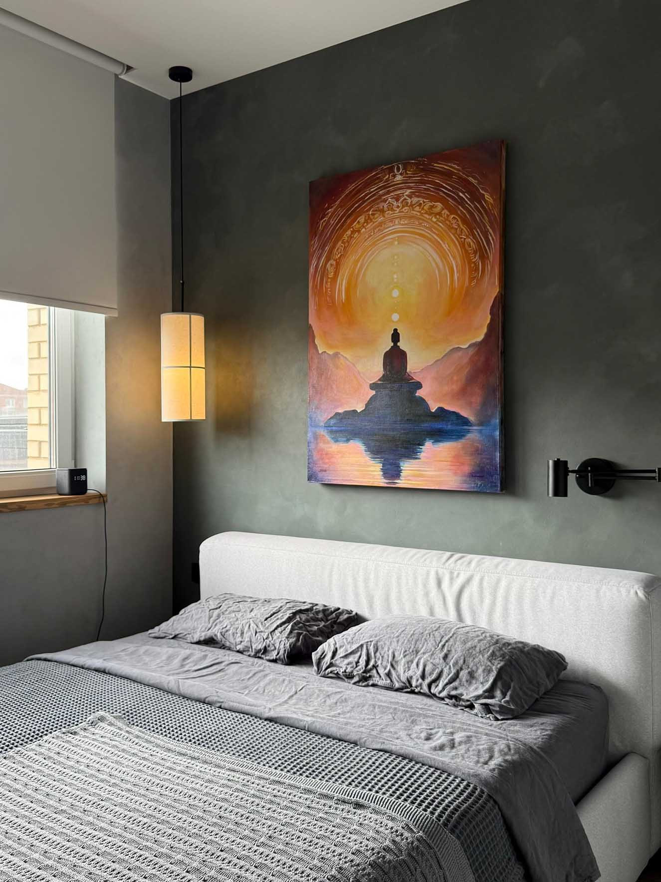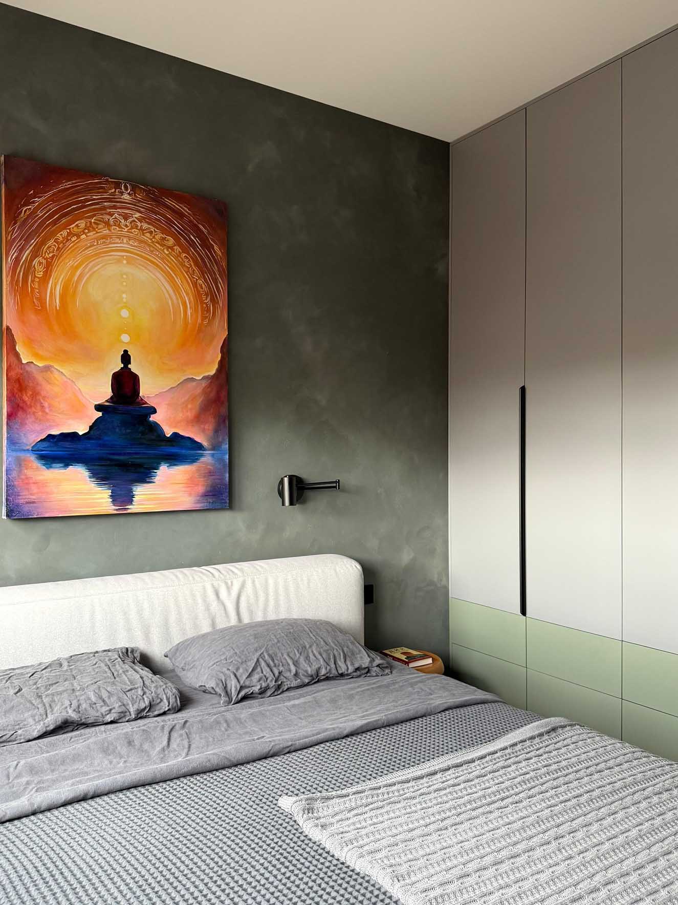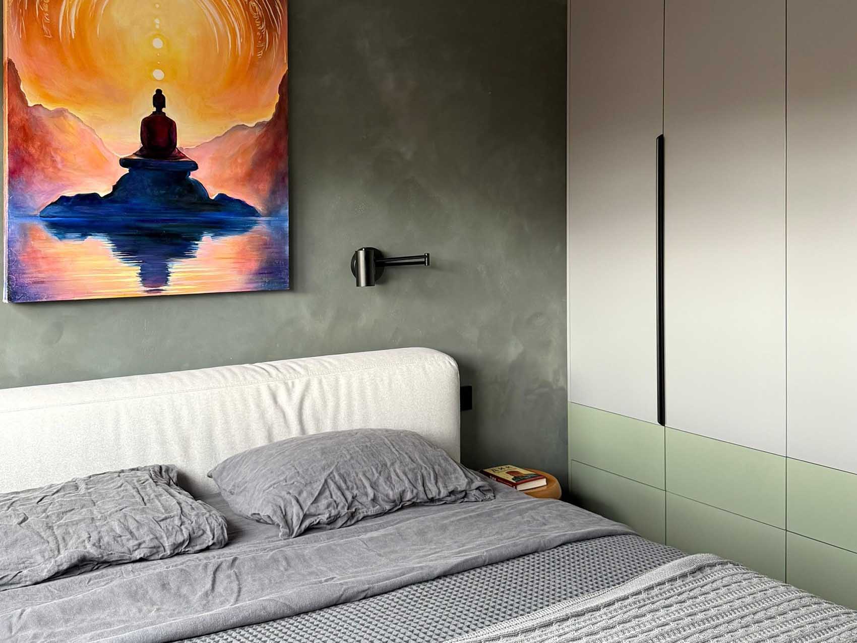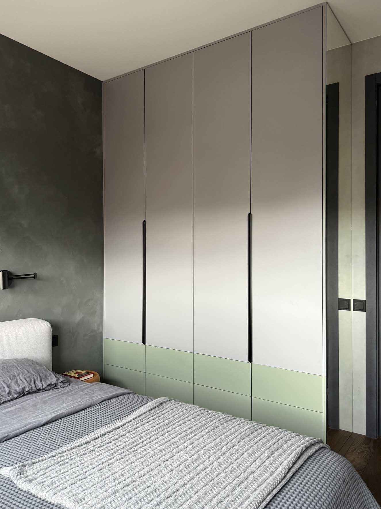 A hálószobát is a “kevesebb több” elve jellemzi: a tárolás funkcióját egy beépített szekrény látja el, a helyiség fókuszpontja pedig a különleges, komplex árnyalatú fal. Ezt a füstös zöld tónust a tervező saját maga kísérletezte ki: az eredeti koncepció szerint dekorvakolatot alkalmaztak volna, ám a kívánt texturált hatást végül a tervező két különböző festéktónus egyedi kombinációjával váltotta ki.