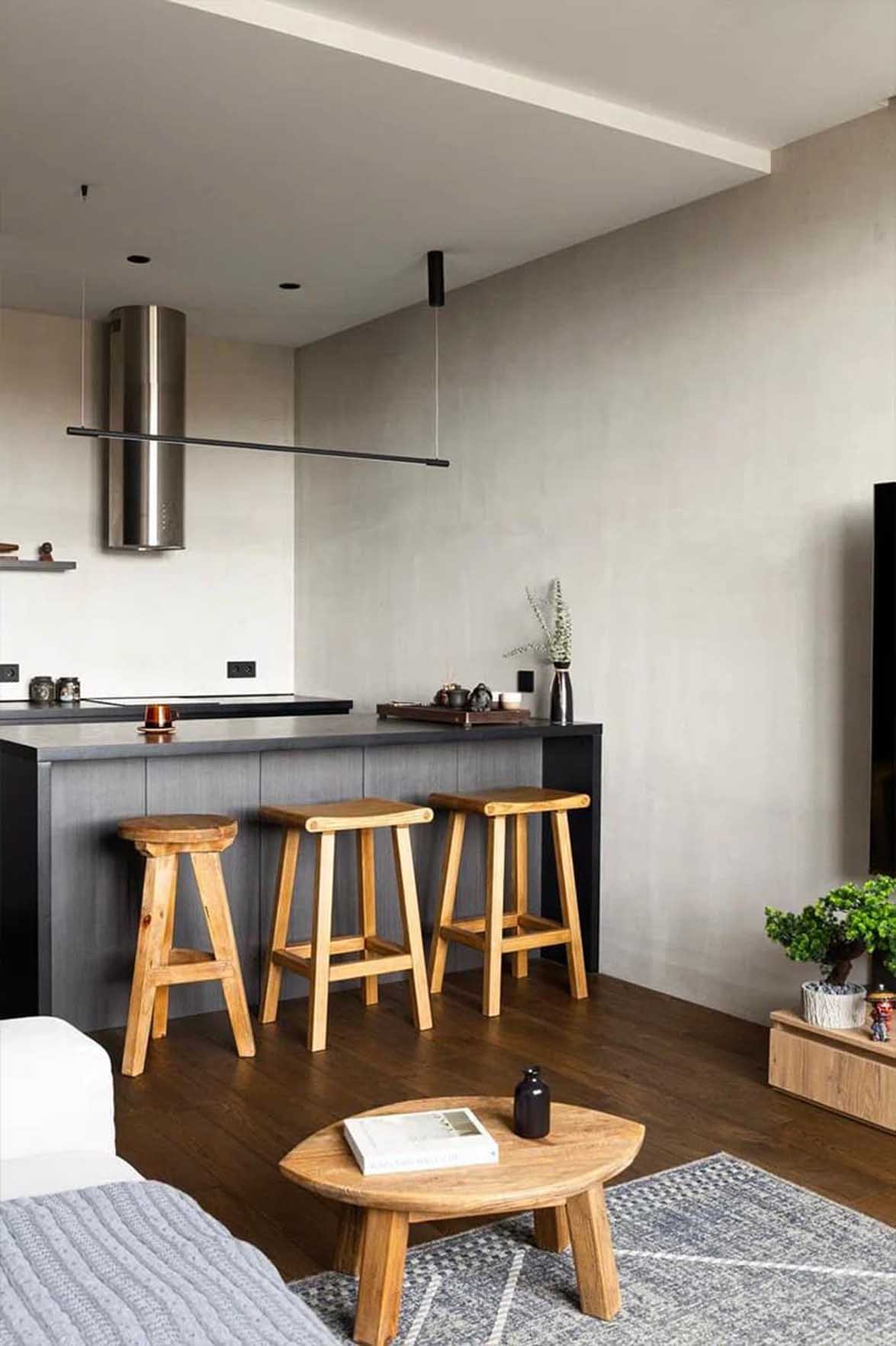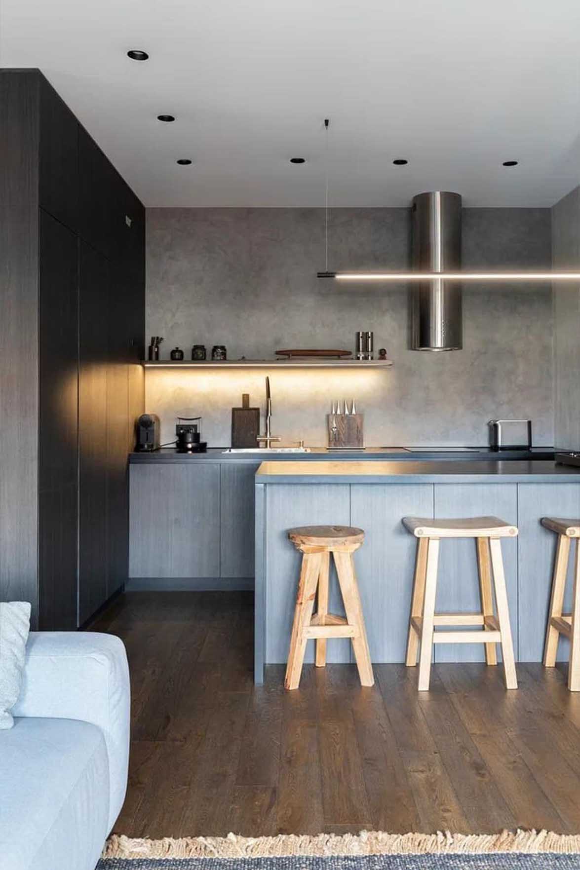 A lakás központi élettere a konyha-nappali, ahol egy kompakt, felső szekrények nélküli konyhabútor kapott helyet. A tervező a projektjeiben gyakran alkalmazza ezt a megoldást, hogy elkerülje a kompozíció túlzsúfoltságát és megőrizze a tér légiességét. A hagyományos étkezőasztal helyett a teret egy bárszékekkel kiegészített félsziget tagolja. Ez a kialakítás ideálisnak bizonyult a tulajdonos életmódjához: kényelmes megoldást nyújt a család, a vendégek és a házigazda számára egyaránt, és ha a tervező otthon dolgozik, akkor dolgozósarokként funkcionál.