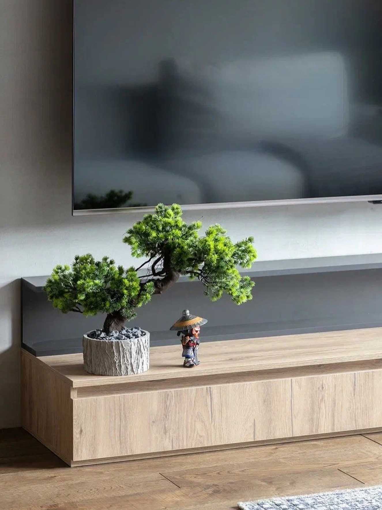 A nappali részben egy ággyá alakítható kanapét helyeztek el. A TV-fal különleges látványeleme az U-alakú, háttérvilágítással ellátott médiaállvány. Ez a világítástechnikai megoldás kulcsfontosságú: a fényhatás nélkül a bútordarab jóval egyszerűbb, hétköznapibb hatást keltene.