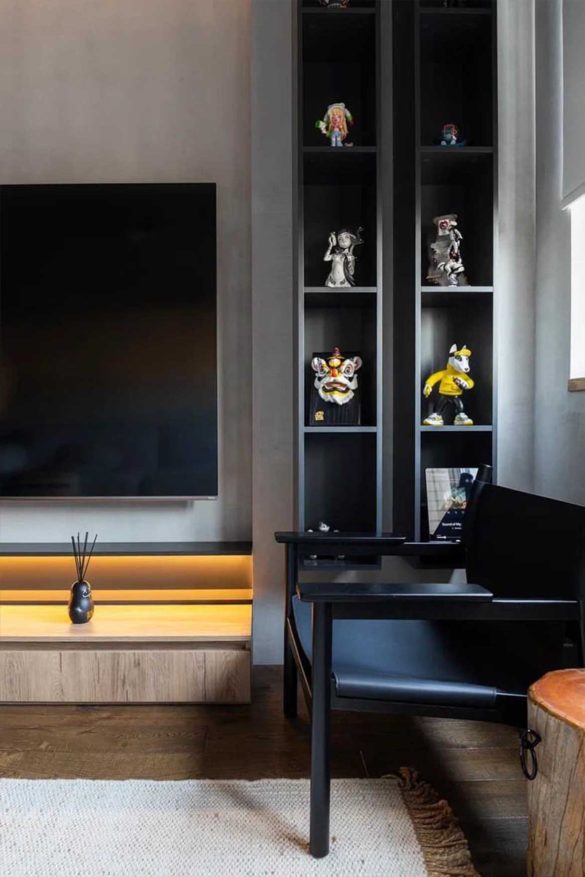 Ez az ingatlan egy belsőépítész otthona, amelyet a férfi elsősorban elvonuláshoz, pihenéshez, otthoni munkavégzéshez, nyugodt, letisztult berendezéssel alakított ki, az enteriőr funkcionális kialakítása teljes mértékben az ő életvitelét tükrözi. A markáns, férfias karakterű enteriőrbe a polcokon elhelyezett gyűjtői figurák csempésznek személyes hangulatot.