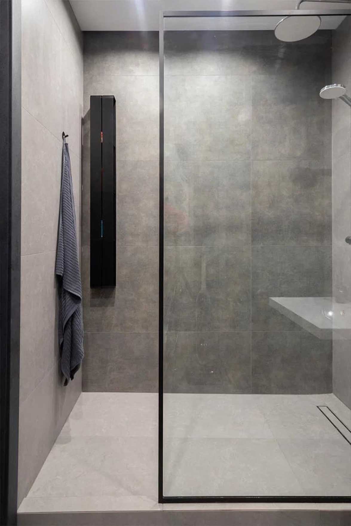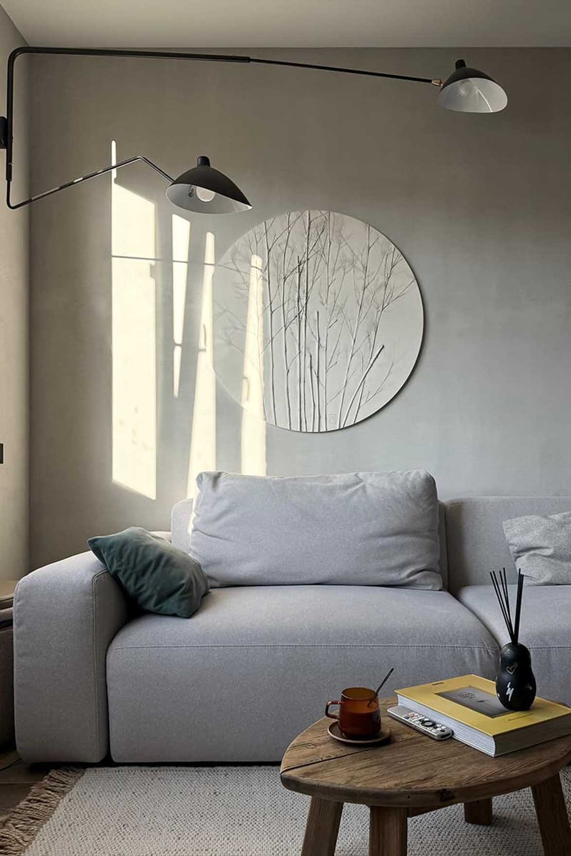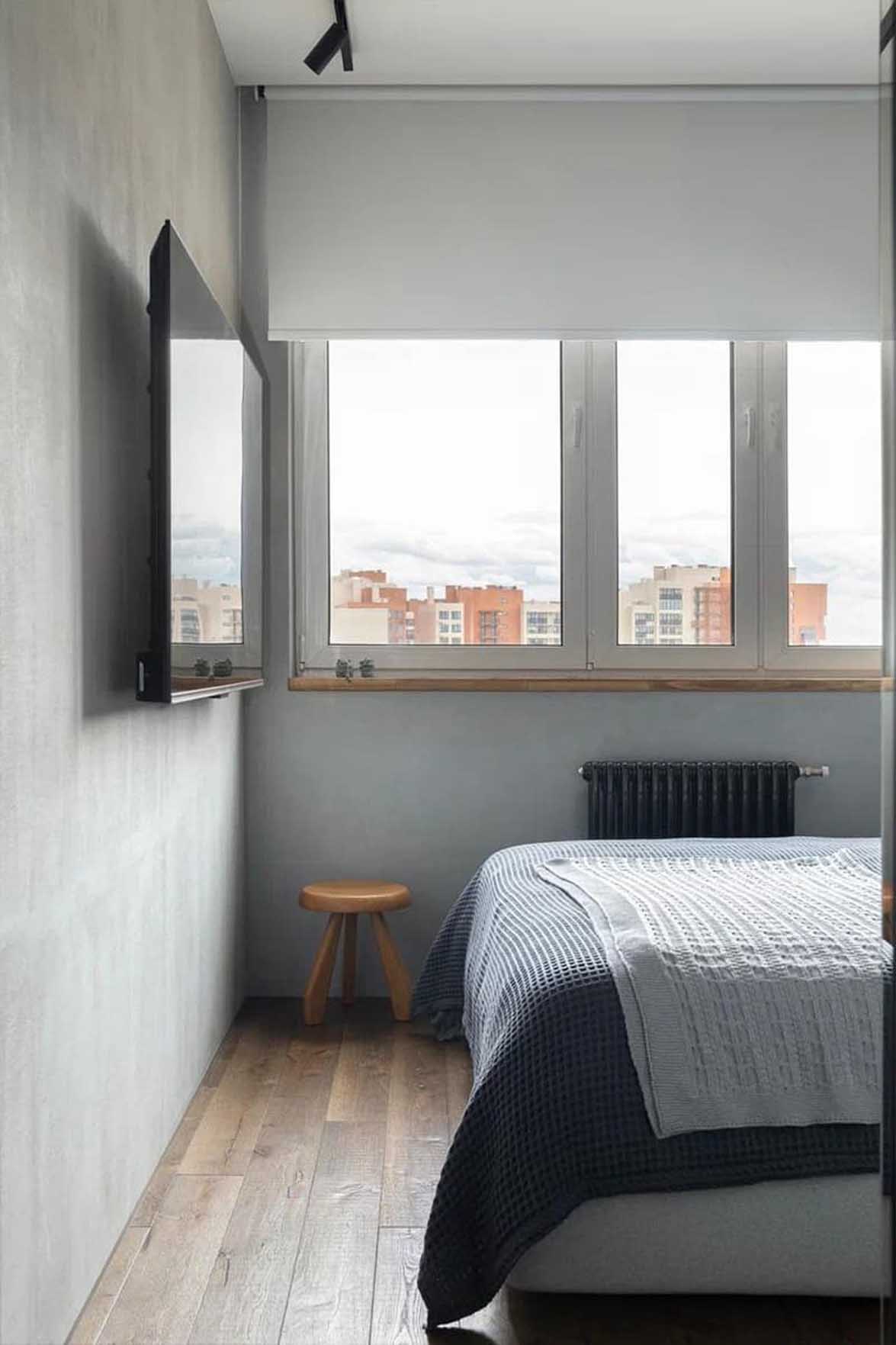 A textíliák használata mindkét helyiségben, a nappaliban és a hálószobában is visszafogott, az ablakokon csupán a letisztult esztétikát erősítő rolós függönyök jelennek meg. Az anyagok természetes tökéletlensége, a következetes minimalizmus és a szürkés színpaletta együttesen egy nyugtató, a külvilágot kizáró hátteret biztosítanak az elmélyült munkához és a pihenéshez.