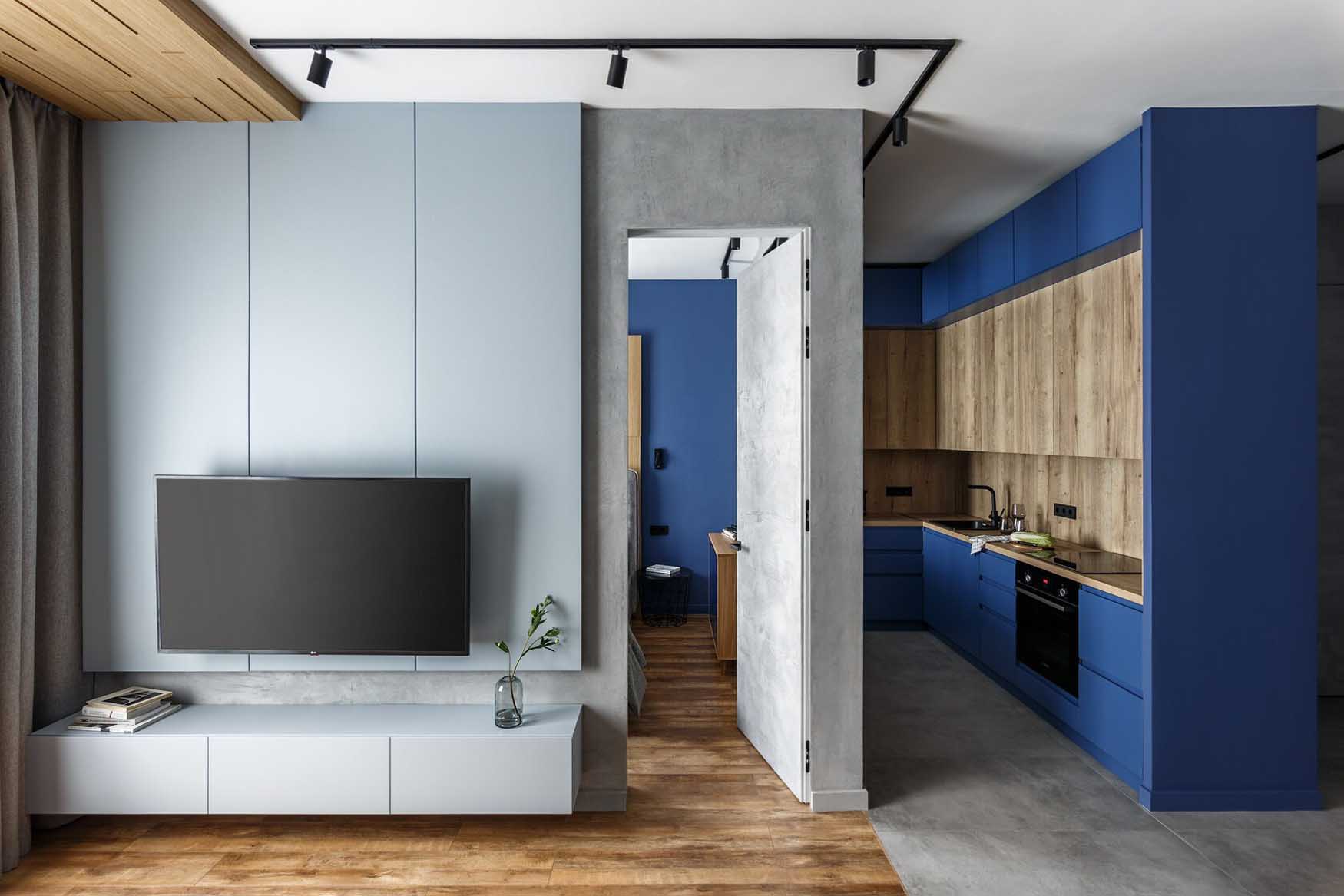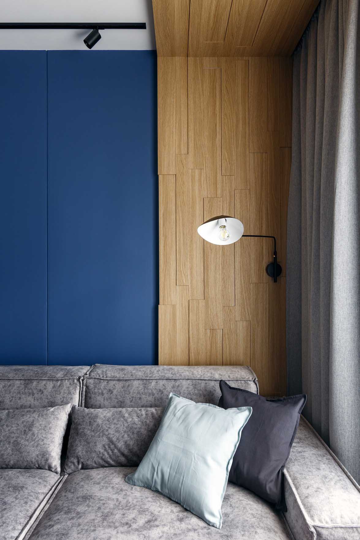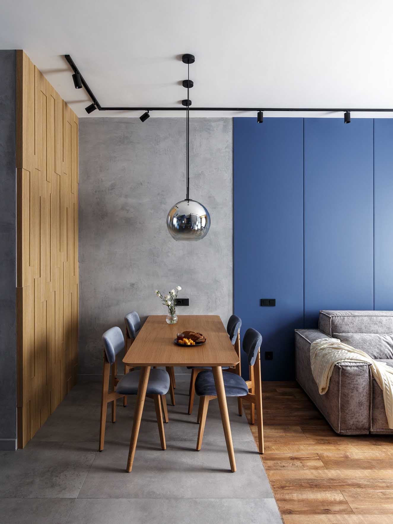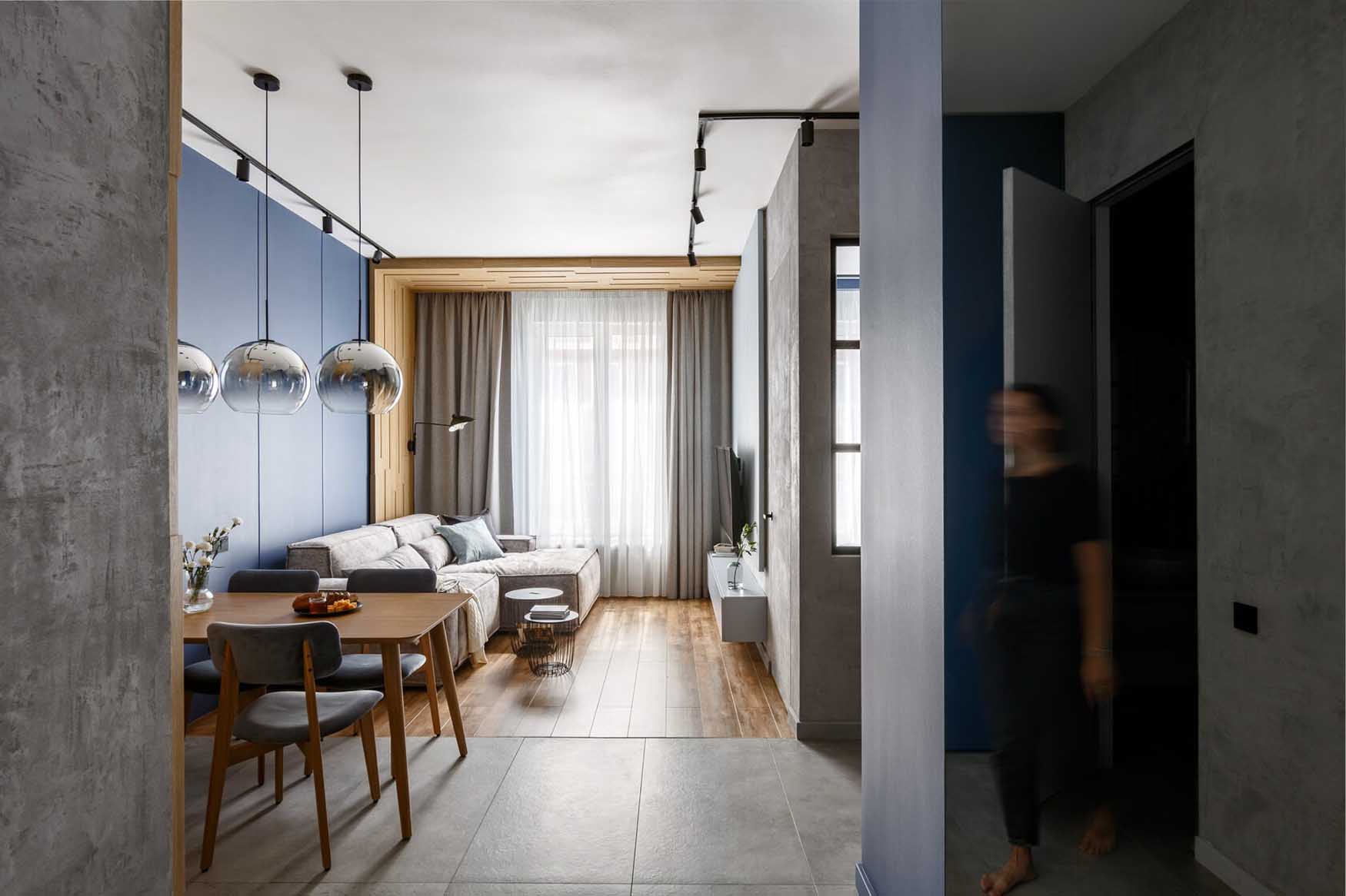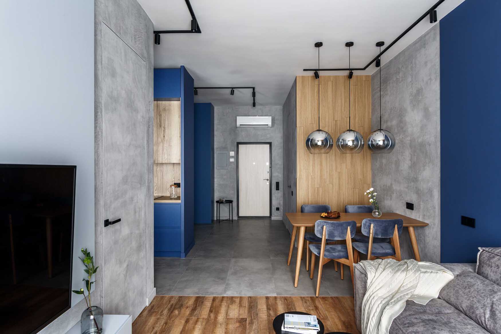 A lakás kialakítása során a funkcionális térszervezésre és a telített, mégis visszafogott színekre koncentráltak. A belsőépítészeti terv vezérfonala a nyers beton felületet idéző dekorvakolat, amelyhez markáns kontrasztként mély kék árnyalatokat és természetes fa textúrákat társítottak – a színválasztás erőteljes karaktert és mélységet ad a térnek. A további anyagok és árnyalatok kiválasztásánál a tökéletes összhangra törekedtek, a kék szín gazdagságát finoman kiemelve hoztak létre egységes, mégis izgalmas vizuális kompozíciót.