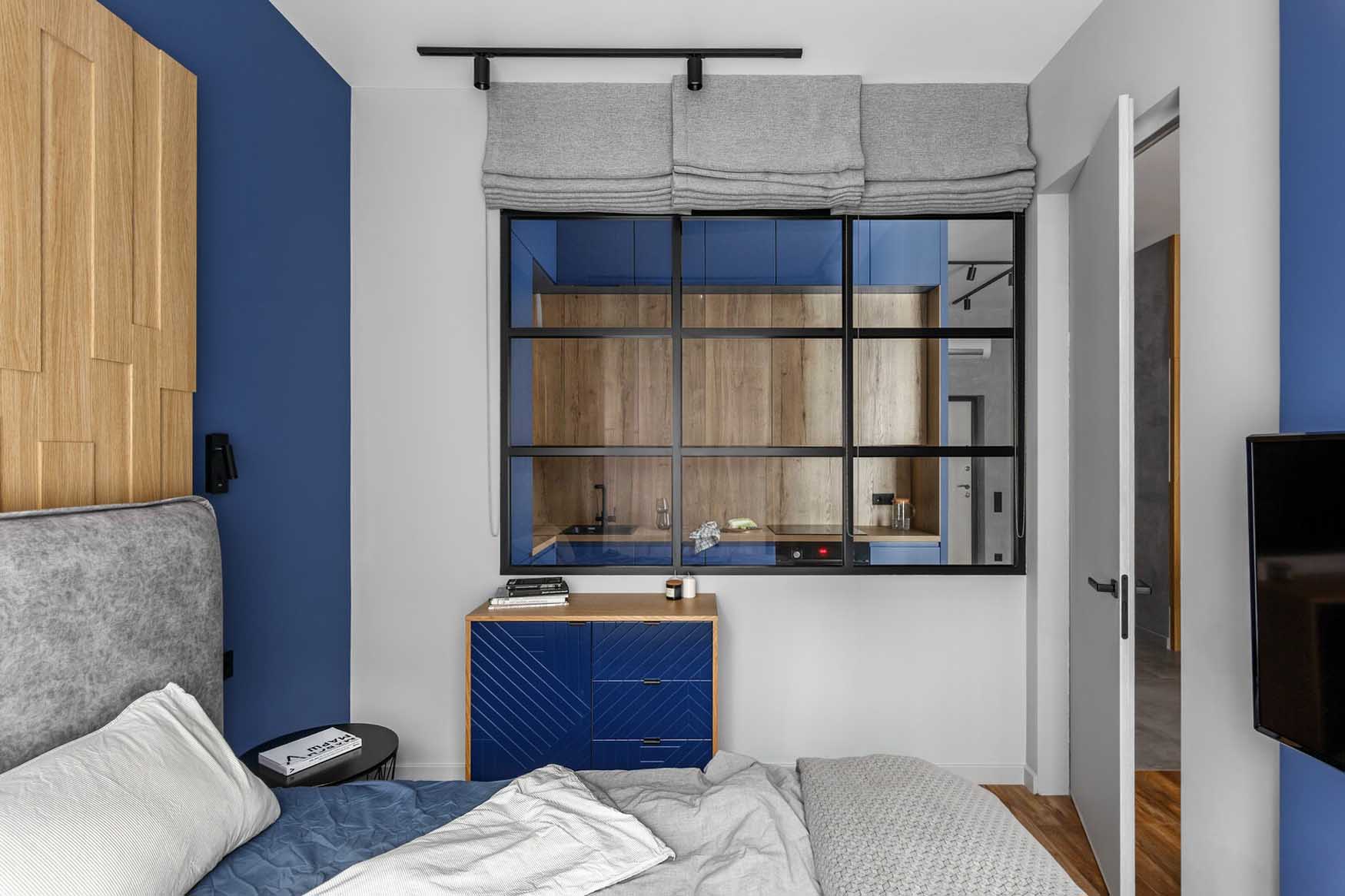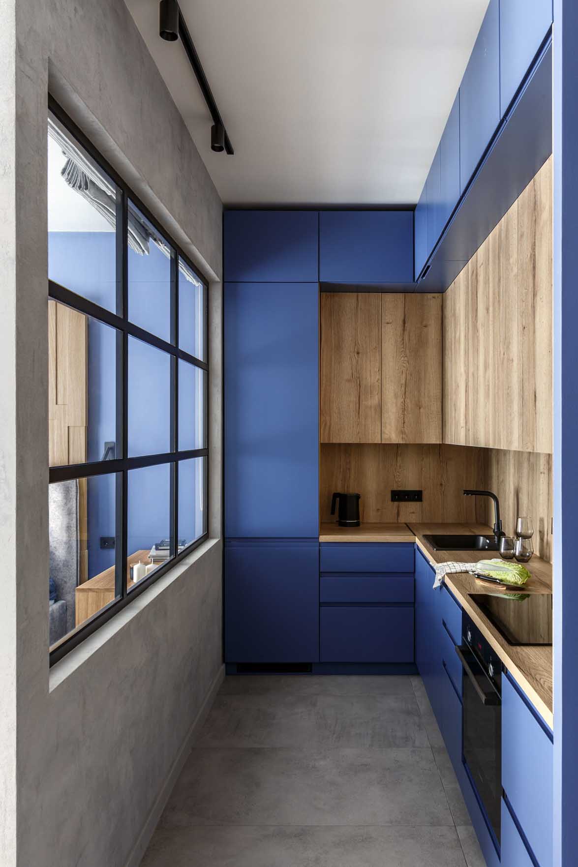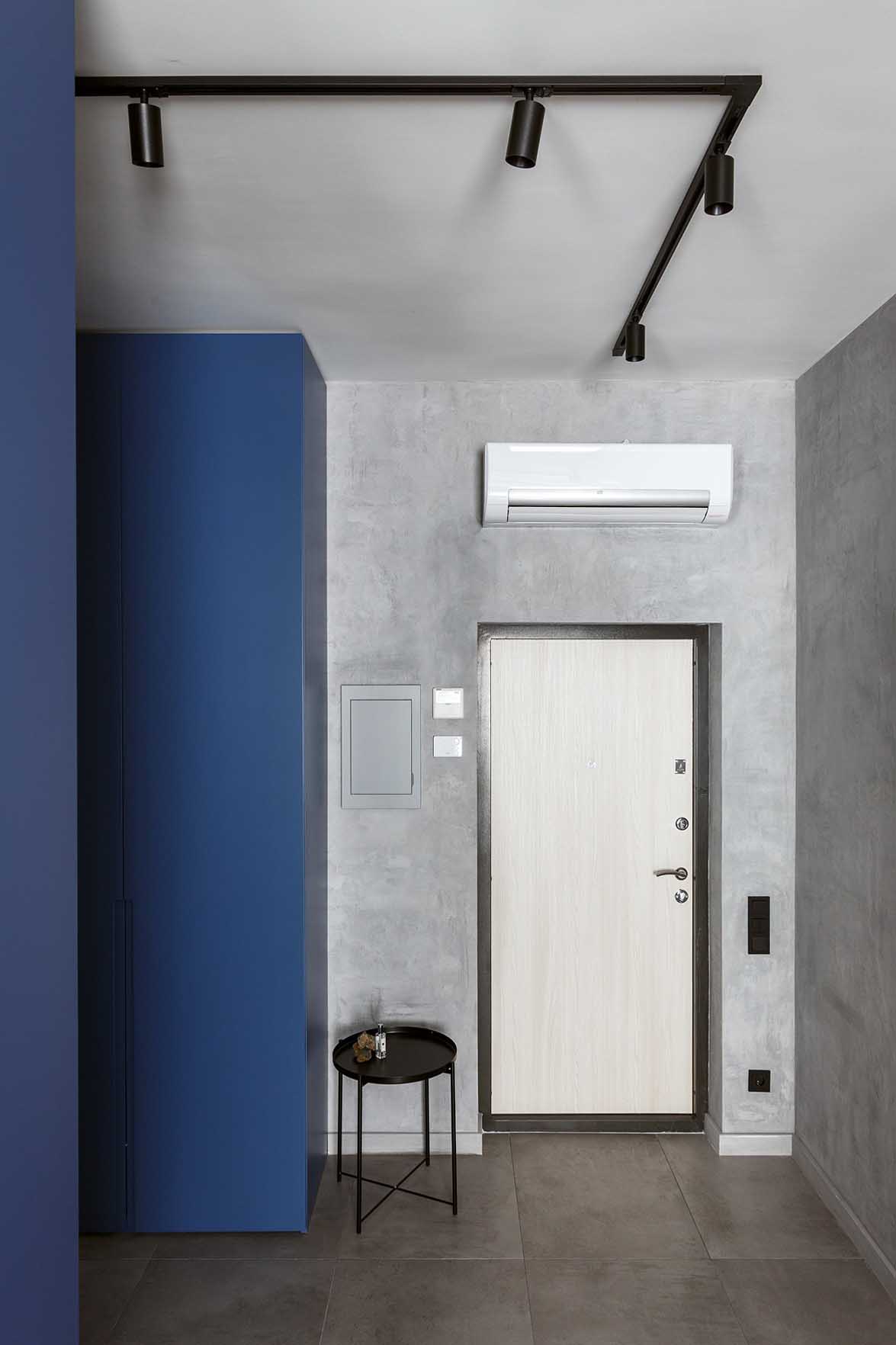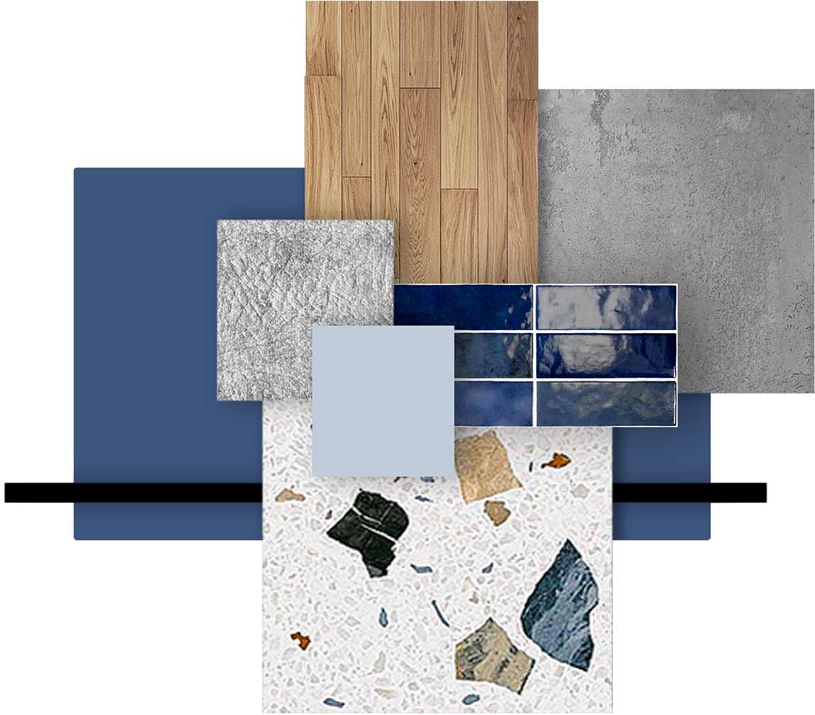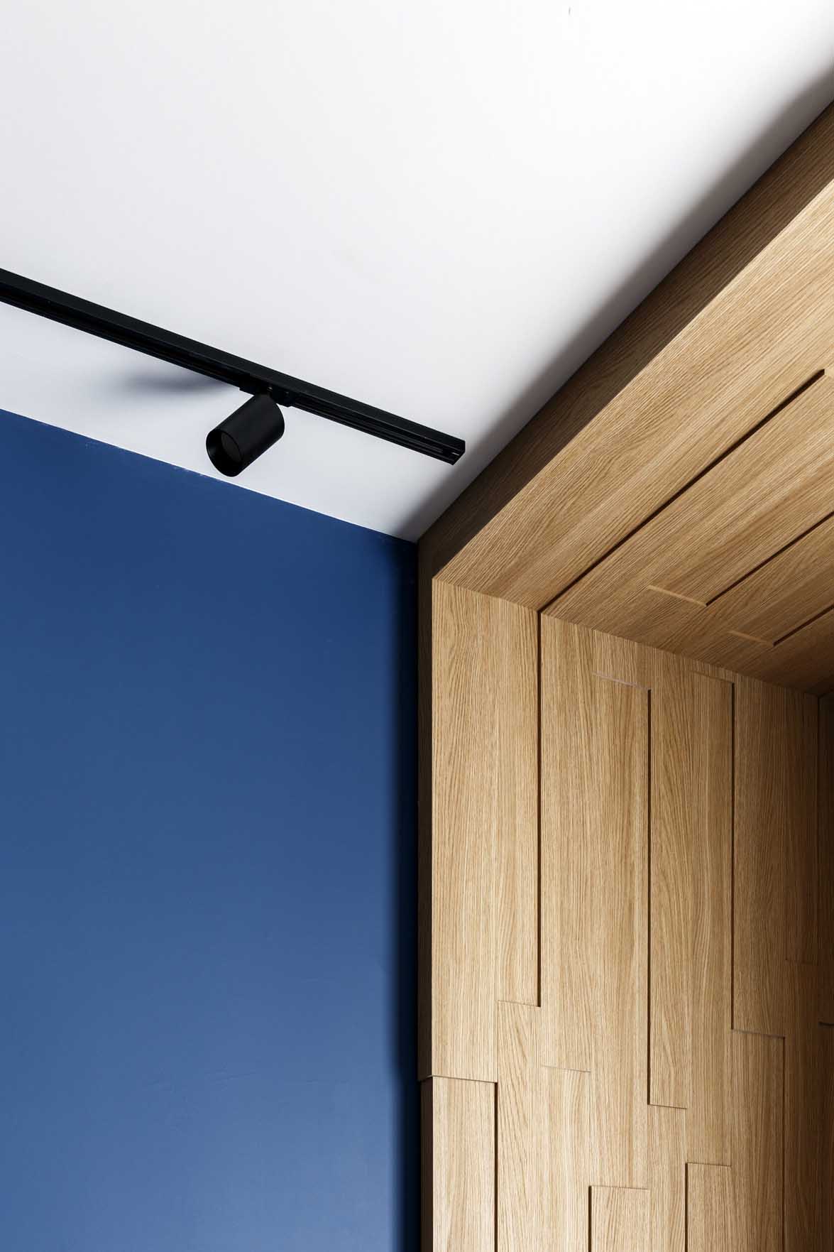 A lakás kialakítása során a funkcionális térszervezésre és a telített, mégis visszafogott színekre koncentráltak. A belsőépítészeti terv vezérfonala a nyers beton felületet idéző dekorvakolat, amelyhez markáns kontrasztként mély kék árnyalatokat és természetes fa textúrákat társítottak – a színválasztás erőteljes karaktert és mélységet ad a térnek. A további anyagok és árnyalatok kiválasztásánál a tökéletes összhangra törekedtek, a kék szín gazdagságát finoman kiemelve hoztak létre egységes, mégis izgalmas vizuális kompozíciót.