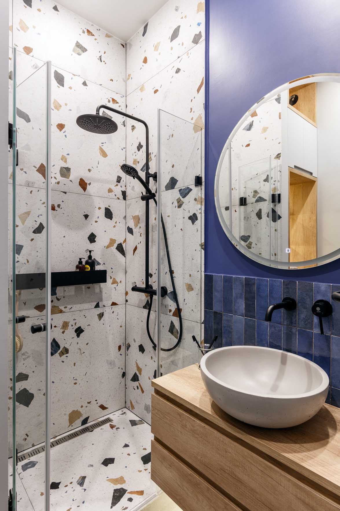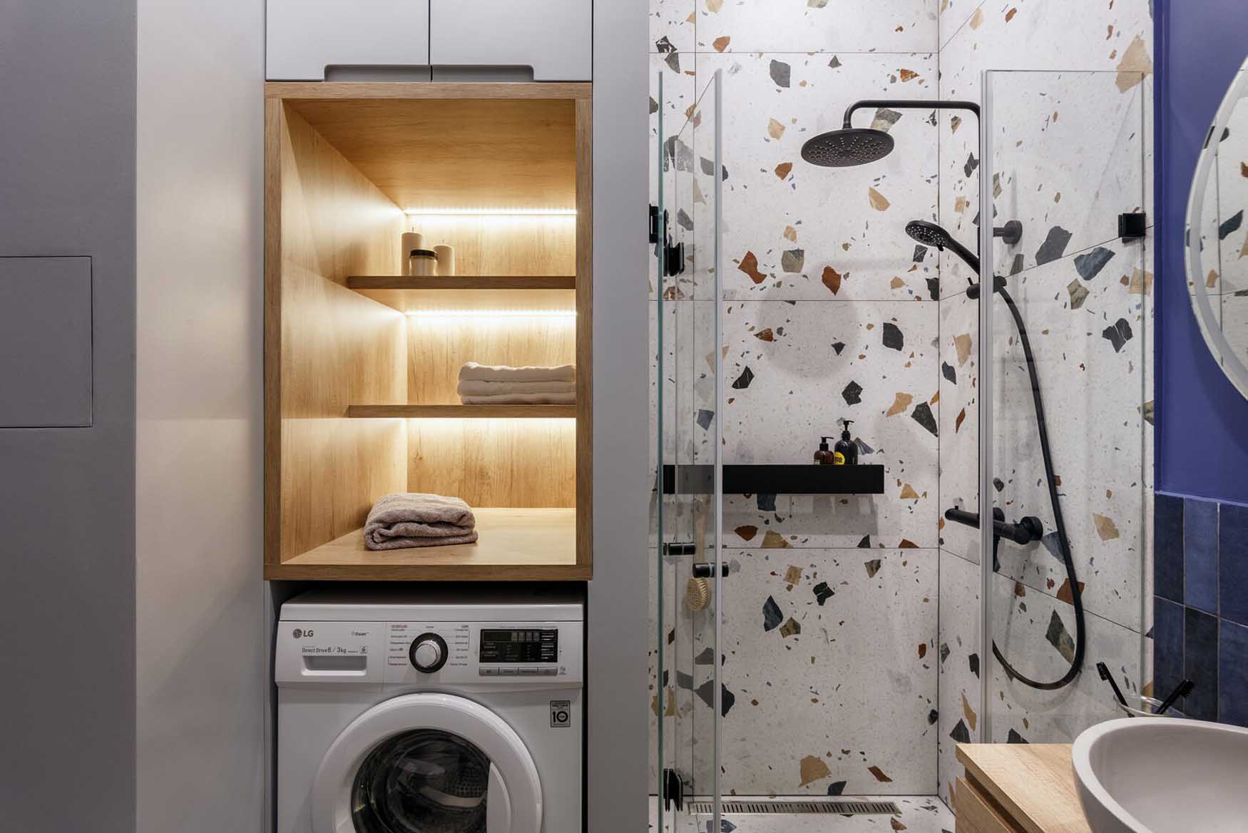 Kényelmes, zuhanyzós fürdőszobát építettek ki, a helytakarékos megoldásnak köszönhetően a divatos terrazzo burkolattal díszített zuhanyfülke mellett egy oszlopban polcokat, zárt szekrényt lehetett kialakítani, alul mosógéppel.