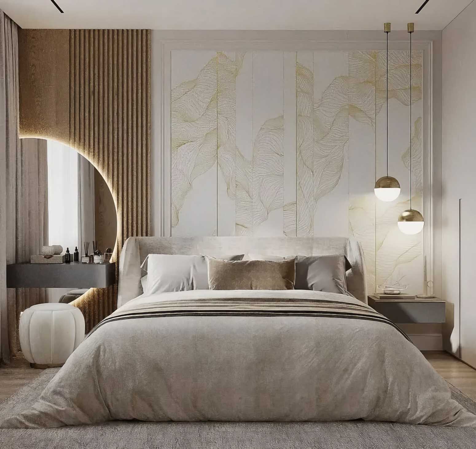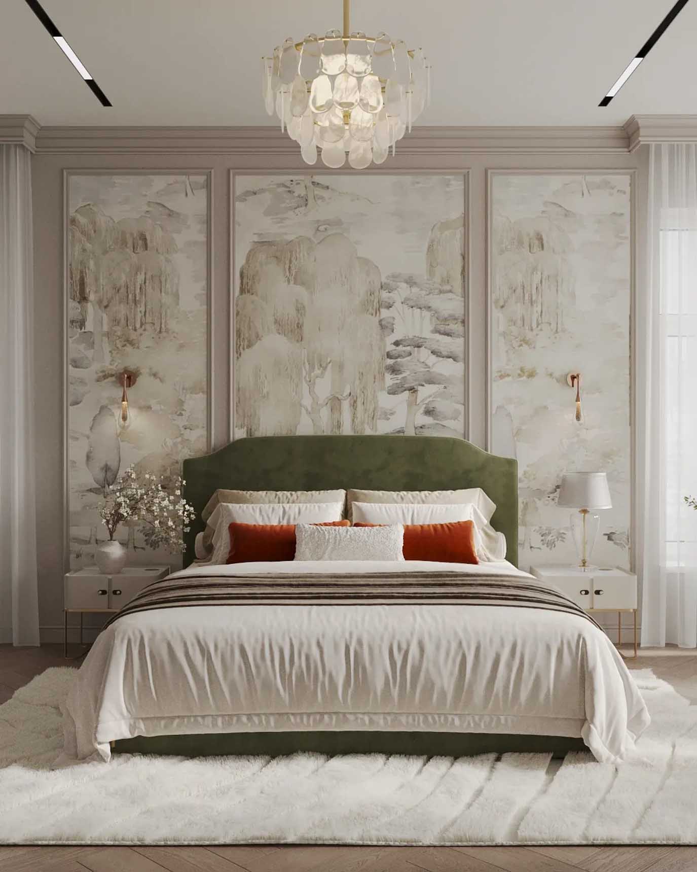 Itt a díszlécekből épített, nagy méretű téglalap „panelek” adják meg a fal architektúráját, a mezőkön belül pedig egy visszafogott, festményszerű tapéta teremti meg a dekorációt. A hatás akkor lesz igazán igényes, ha a panelek ritmusa szimmetrikus az ágy tengelyére, és a keretek szélessége is következetes. Plusz pont a falikarok pozicionálása: így a világítás nem utólag rátett elemnek tűnik, hanem a faldekoráció része lesz.