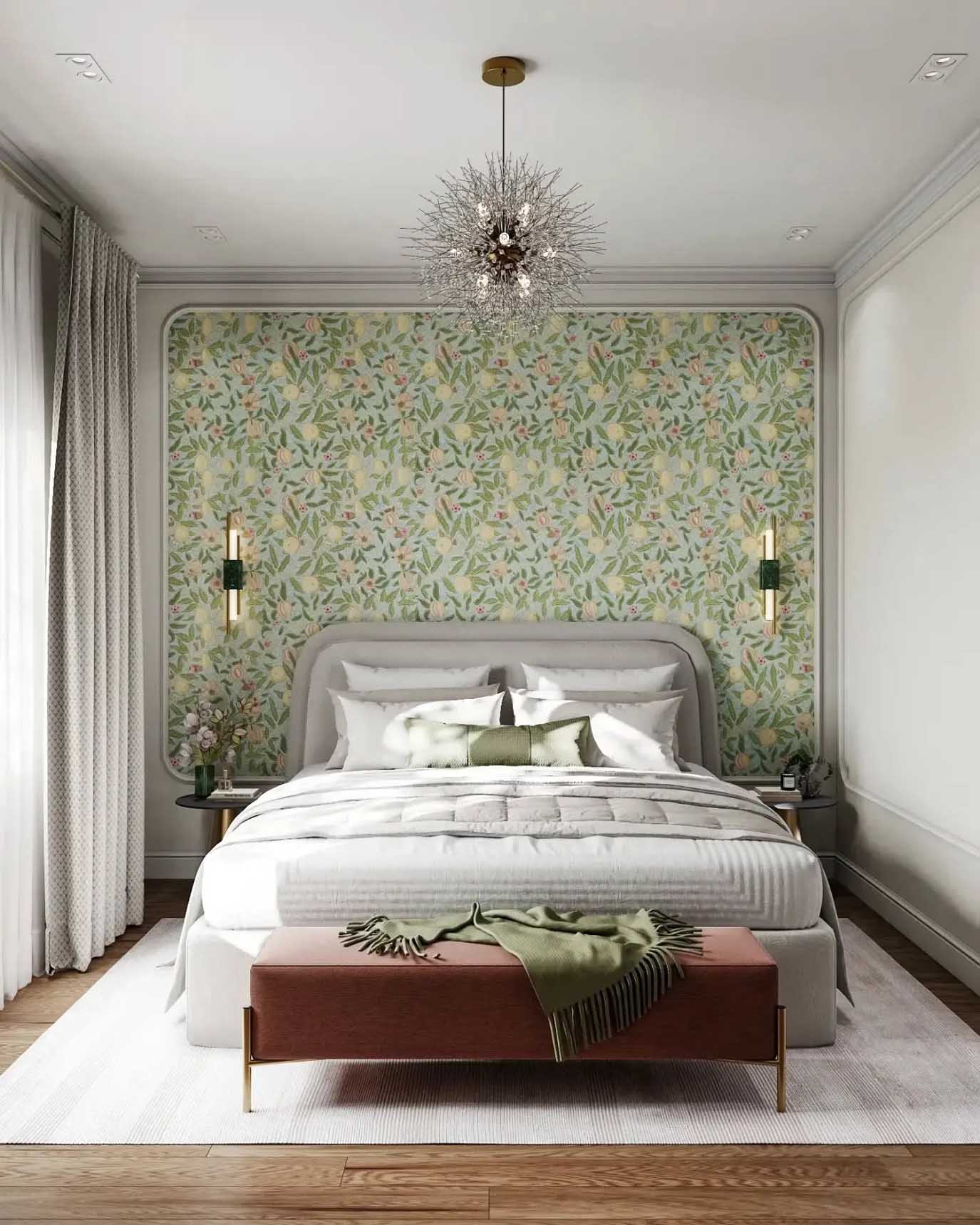 Ebben a megoldásban nem több kisebb panel épül, hanem egy nagy, központi „mező”, amit lekerekített sarkú keretezés (díszlécből kialakítva) emel ki. A belső felületet mintás tapéta tölti ki, ami puhábbá teszi a geometrikus keretet, és finom, hálószobához illő részletgazdagságot ad. A két oldali falikar itt is a kompozíció része: rendezett, függőleges hangsúlyt adnak a részletgazdag mintában.
