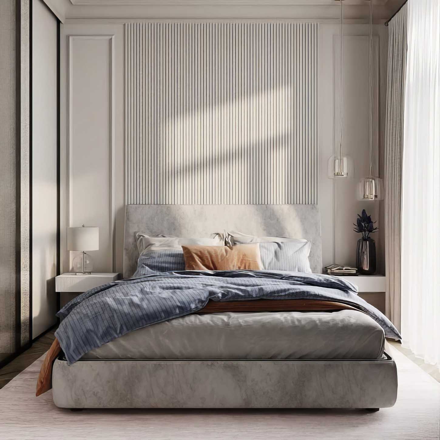 Ez a verzió szinte monokróm, mégis látványos: a díszléc egy nagy és a két szélen magas, keskenyebb kereteket ad. Az ágy fejvég mögött bordázott falpanel fut majdnem a mennyezetig. A díszítés lényege itt nem a minta, hanem a fény-árnyék játék: a bordázat nappal és esti megvilágításban is finoman „mozgatja” a falat. Praktikus megközelítés, hogy a panel és a díszléc azonos (vagy nagyon közeli) színre van festve, így a hatás elegáns és nyugodt marad. Akkor lesz igazán rendezett, ha a panel mérete igazodik az ágy szélességéhez, és a bútorok is letisztultak maradnak mellette.