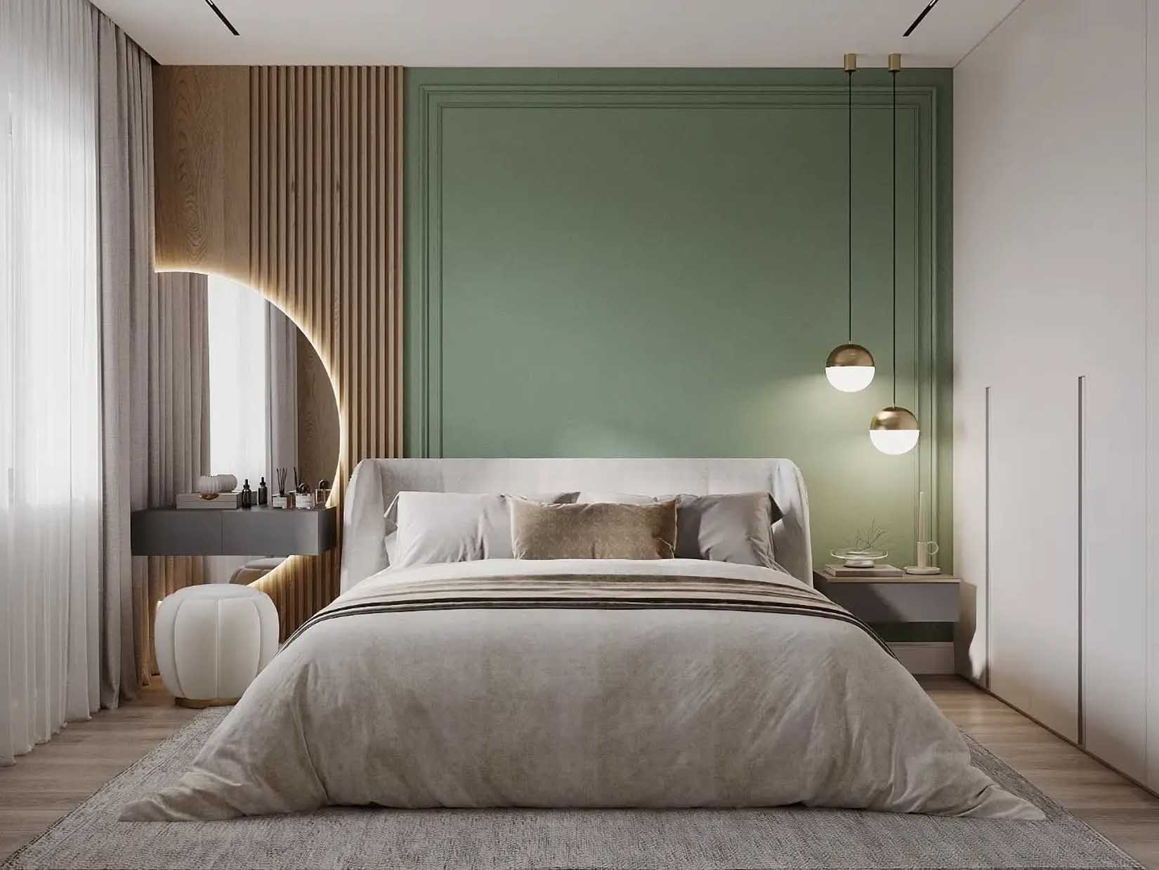 Ebben a kompozícióban a díszléc keretezi a fő, színes felületet: a fal nagy része egységes, zöldre festett „színblokk”, amit a keretezés tesz építészetileg határozottá. A bal oldali lamellás fa és az ívesen megvilágított tükör/konzol zóna egy második hangsúlyt ad, így a fal nem csak „egy színes téglalap”, hanem több rétegű anyag- és fényjáték. A két függesztett lámpa a díszlécmezőn belül marad, ettől a kép rendezett. Ez a megoldás akkor működik a legjobban, ha a színblokk tónusa visszaköszön a textilekben vagy kiegészítőkben, de nem próbál mindent átvenni.