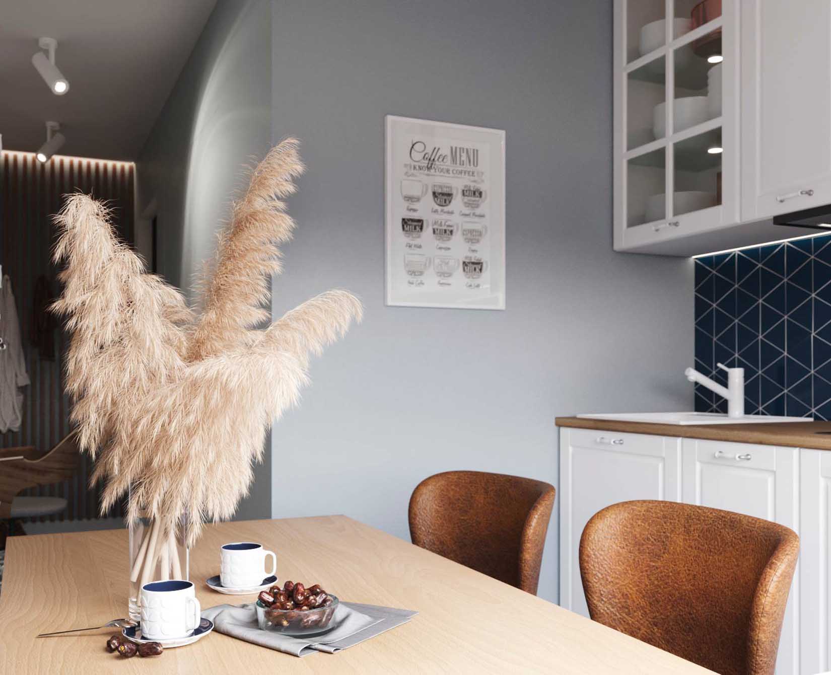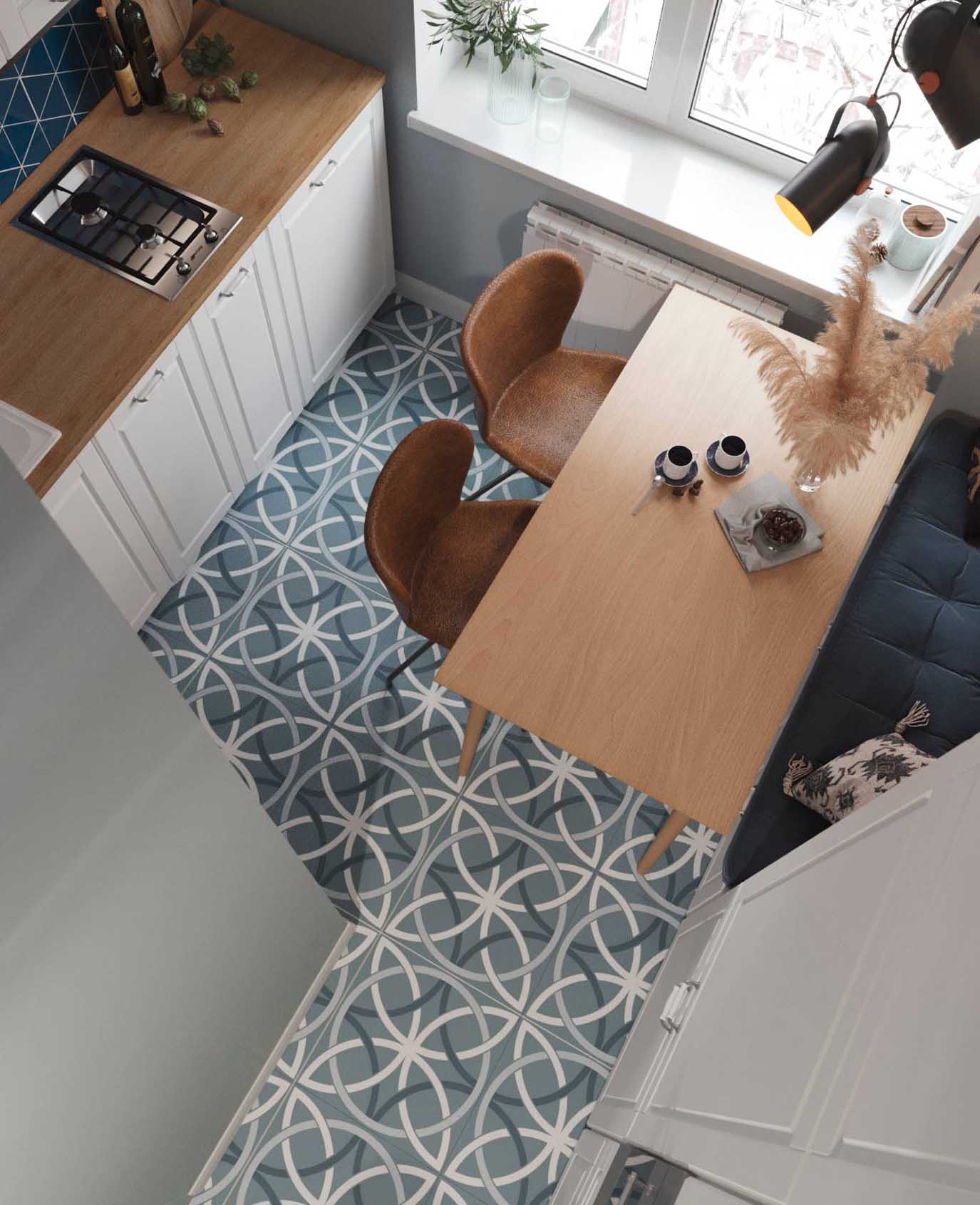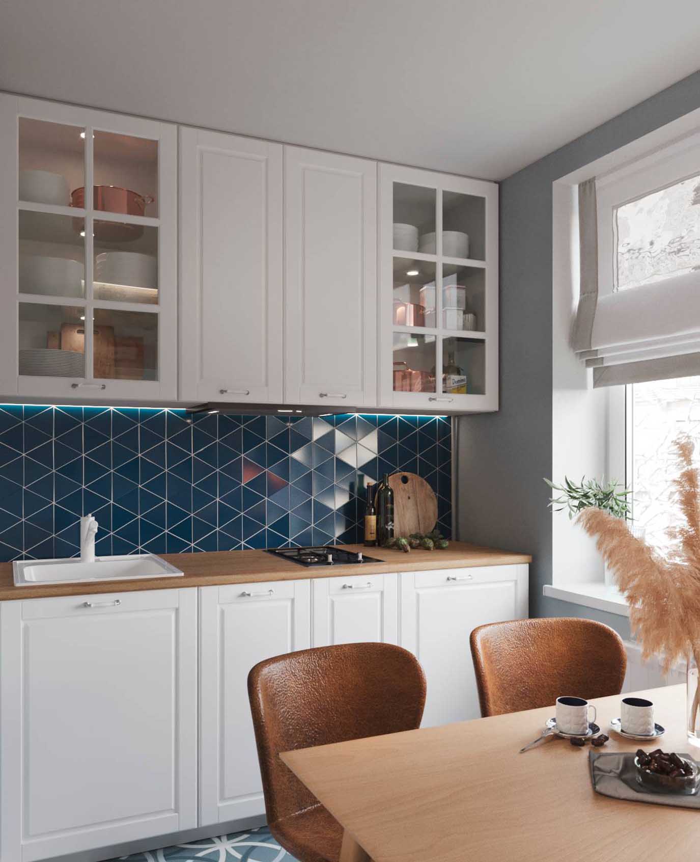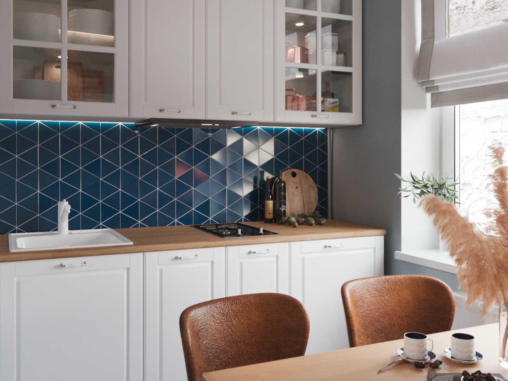 Egy kis konyhában, ahol a bútorok fehérek és egyszerű vonalvezetésűek, a térérzet növelése érdekében szükség van egy fókuszpontra. A tervező itt egy mélykék, geometrikus mintázatú csempét (Equipe Scale) választott a konyhapult mögötti falra. Ez a merész színválasztás mélységet ad a térnek, és elegáns kontrasztot alkot a fa munkalappal, valamint a fehér frontokkal. A felső szekrények üveges elemei szintén a légiességet szolgálják, megtörve a zárt felületek monotonitását