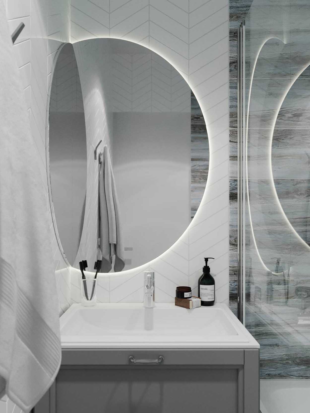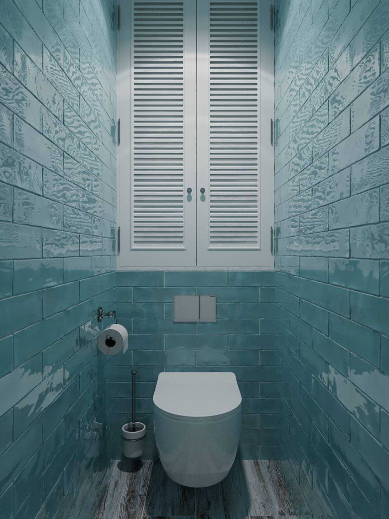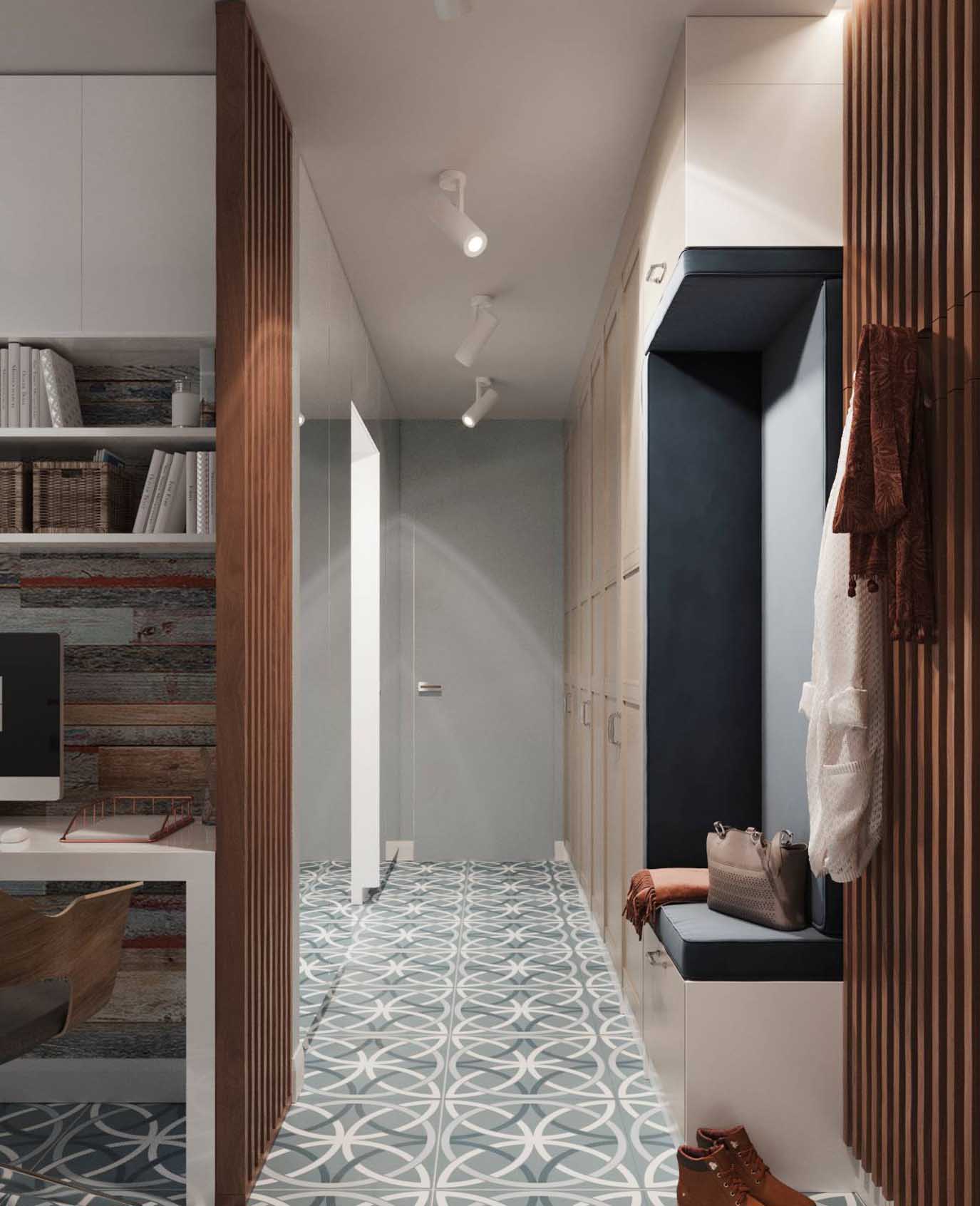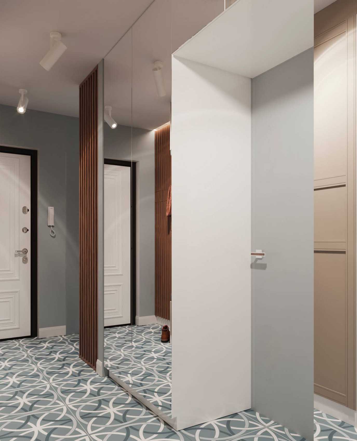 Szűk folyosók és előterek esetén az egyik leghatékonyabb eszköz a nagyméretű tükörfelületek alkalmazása. Ebben a lakásban a bejárati zónában a padlótól mennyezetig érő tükrös szekrényfrontok visszaverik a fényt, így a sötétebb, ablak nélküli közlekedő is világosabbnak, levegősebbnek hat. Érdemes a padlóburkolattal is játszani: itt a geometrikus mintázatú járólap (Dualgres Bosham Blue) vezeti a szemet, elterelve a figyelmet a tér szűkösségéről.