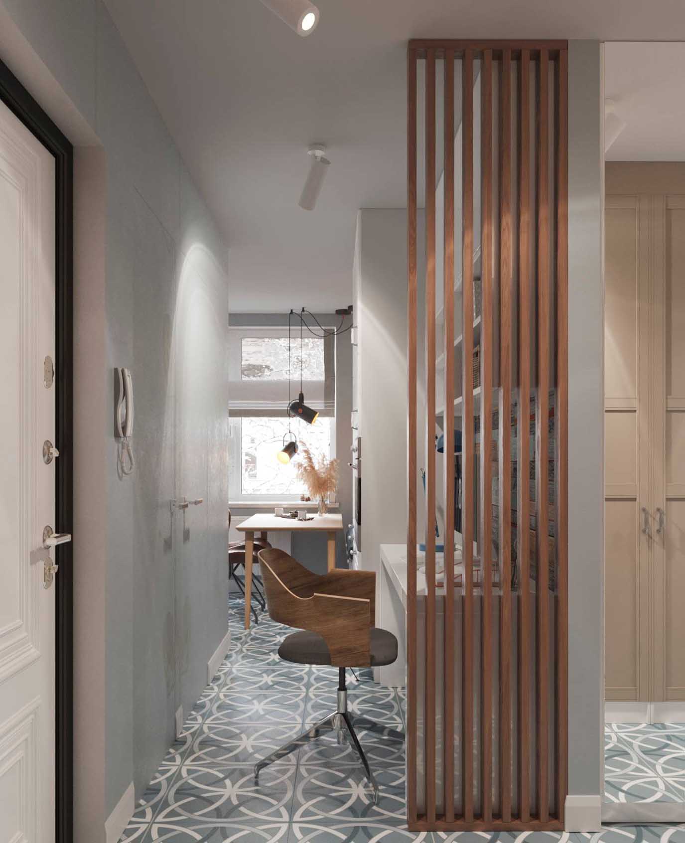 A nyitott terek előnye a világosság, hátránya a funkciók összemosódása. A falak felhúzása helyett azonban érdemes könnyedebb megoldásokat választani. A képeken látható fa lamellás térelválasztó kiváló példa erre: kijelöli a közlekedő és a dolgozósarok határát, intimitást ad az íróasztalnál ülőnek, ugyanakkor átengedi a természetes fényt. Ez a megoldás a skandináv stílusba is remekül illeszkedik, egy kis melegséget csempészve a modern enteriőrbe.