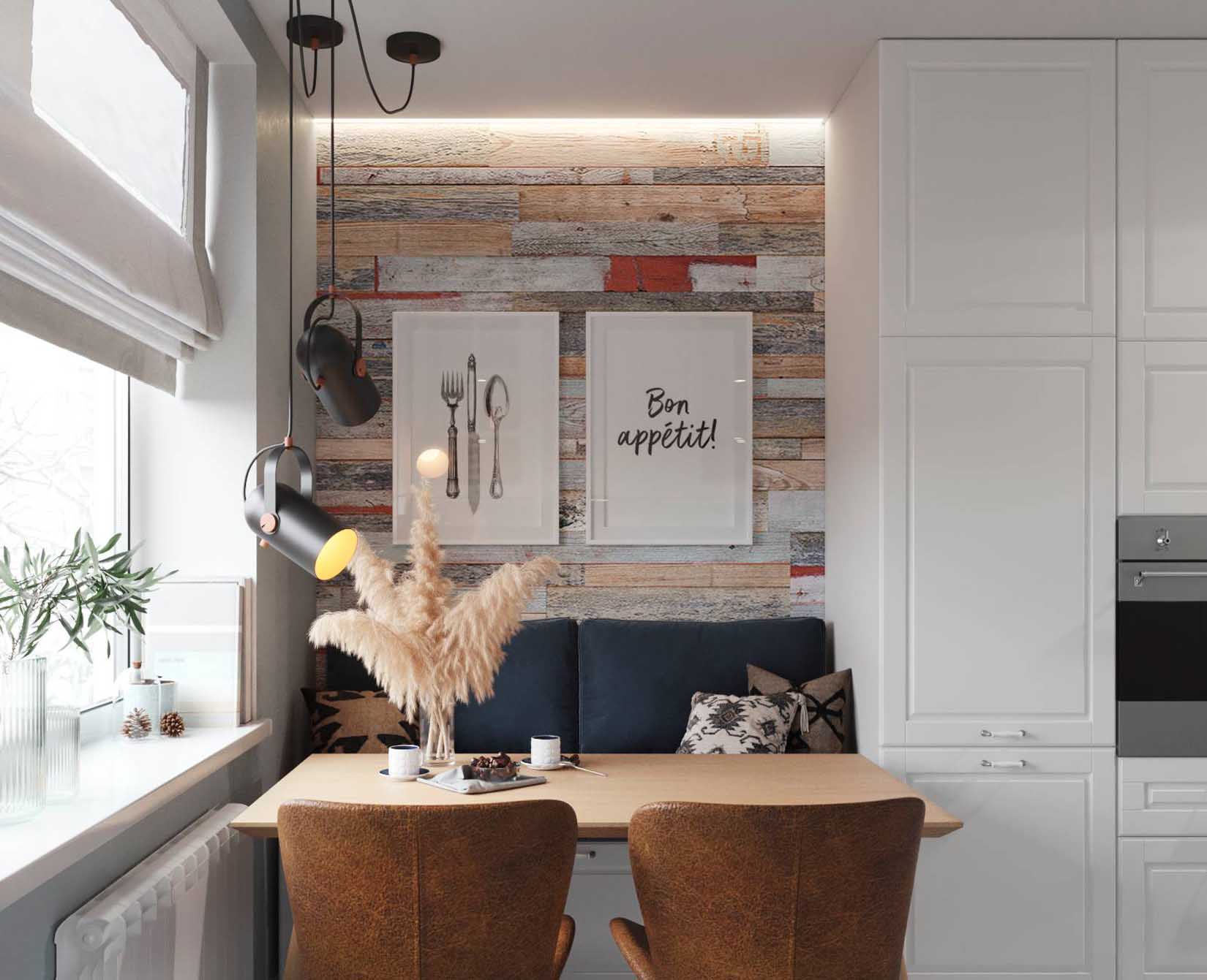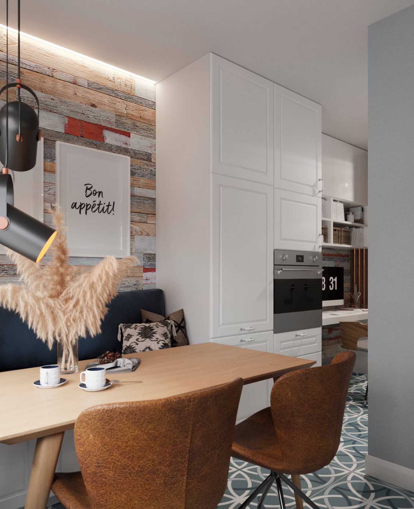 Kis lakásokban gyakori probléma az étkezőasztal elhelyezése. Ha nincs hely külön étkezőhelyiségre, a konyhán belül érdemes kijelölni a zónát. Itt a falburkolat kapta a főszerepet: a rusztikus, kopottas fa hatású panel vizuálisan leválasztja az étkezőt a konyha többi részéről. A helytakarékosság jegyében székek helyett padot is beépítettek, amely alatt – a rendelkezésre álló helyet maximálisan kihasználva – további tárolórekeszek kaptak helyet.