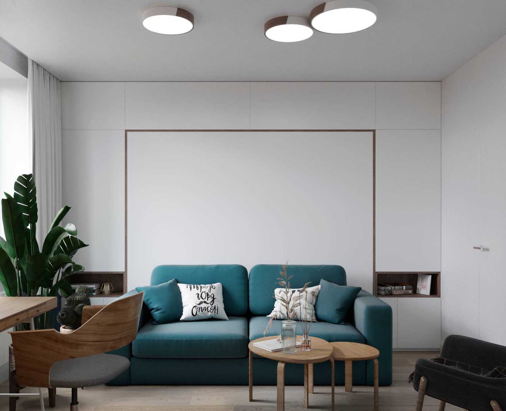 Ahol nincs lehetőség külön szülői hálószoba kialakítására, ott a nappalinak kell ezt a funkciót ellátnia. A kényelmetlen kinyitható kanapék helyett azonban létezik elegánsabb megoldás: a szekrényágy. Ebben az enteriőrben a kanapé mögötti, zárt szekrénynek tűnő fal rejti a franciaágyat. Napközben a tér tágas nappaliként és dolgozószobaként funkcionál, este pedig egyetlen mozdulattal teljes értékű hálóvá alakul, anélkül, hogy a nappali esztétikája sérülne.