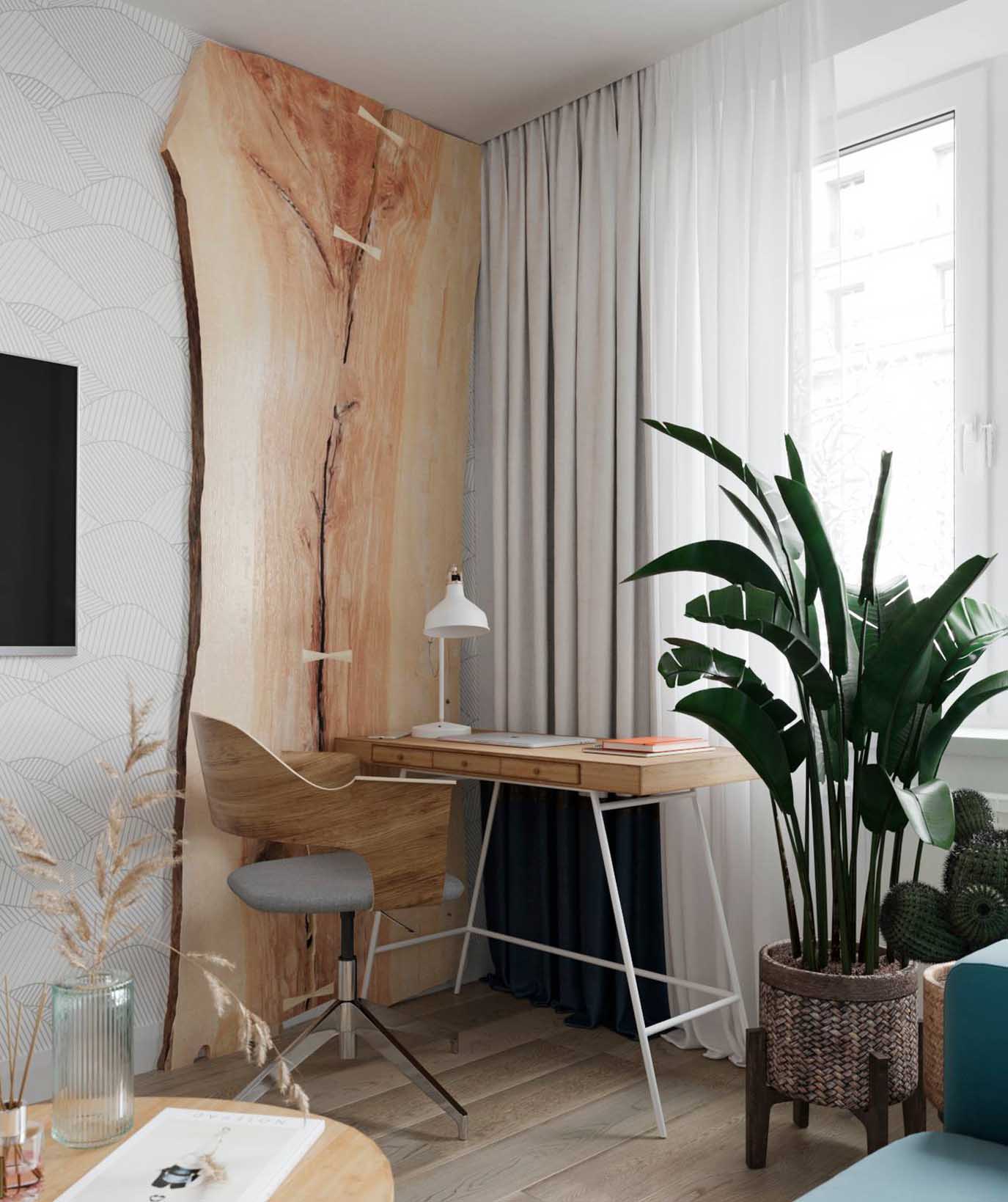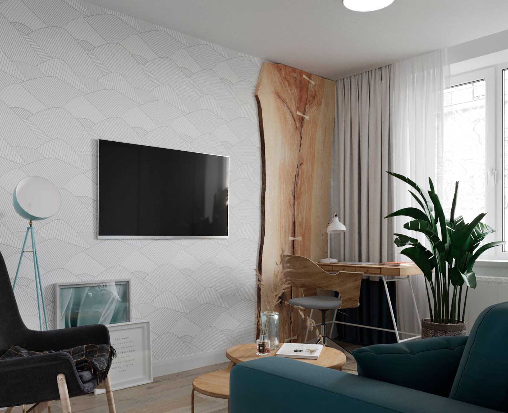 A modern, letisztult terekben fontos a természetközeliség megjelenítése, hogy az otthon ne hasson sterilnek. A nappaliban látható masszív fa panel nemcsak dekoráció, hanem a tér struktúráját is gazdagítja. A finom rajzú tapéta és a fa elem kombinációja mozgalmassá teszi a TV falat, elvonva a figyelmet a technikai eszközökről.
