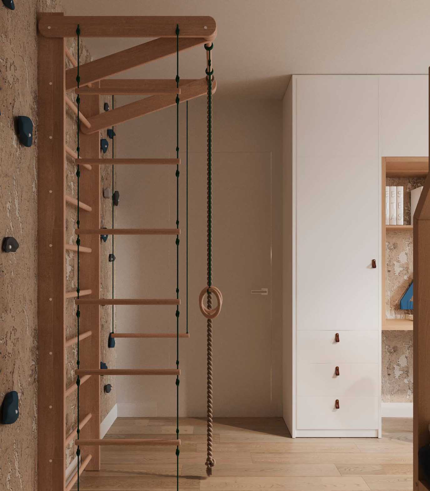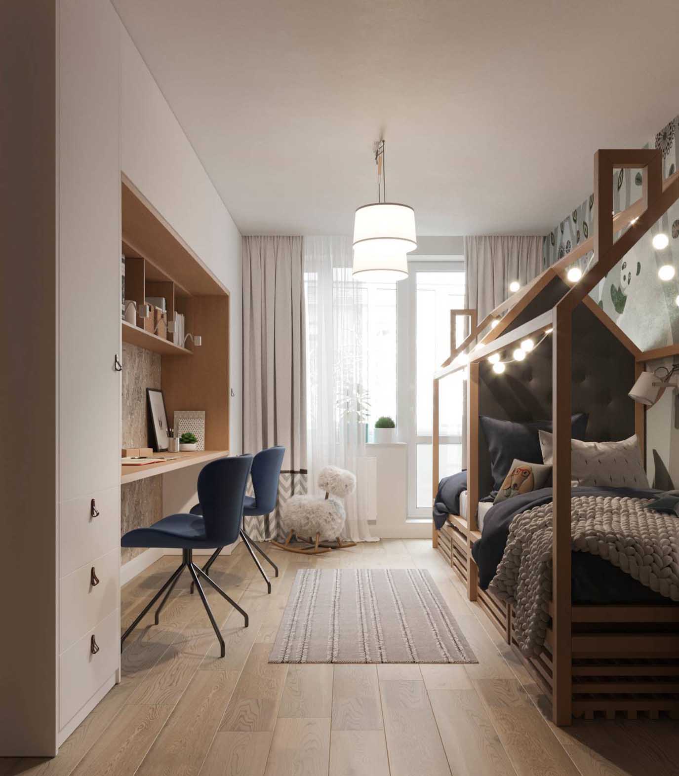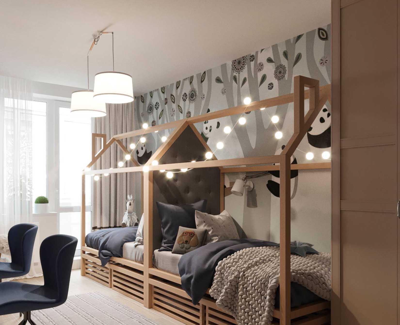 Két gyermek esetén egy kis szobában a vertikális terjeszkedés elengedhetetlen. A házikó formájú ágy nemcsak alvóhely, hanem a gyerekek saját kis birodalma is. A szerkezet kialakítása lehetővé teszi, hogy az ágy alatti fiókokban rengeteg játék vagy ruha elférjen. A játékosságot a tematikus tapéta és a hangulatvilágítás fokozza, barátságos kuckóvá varázsolva az alvóhelyet.