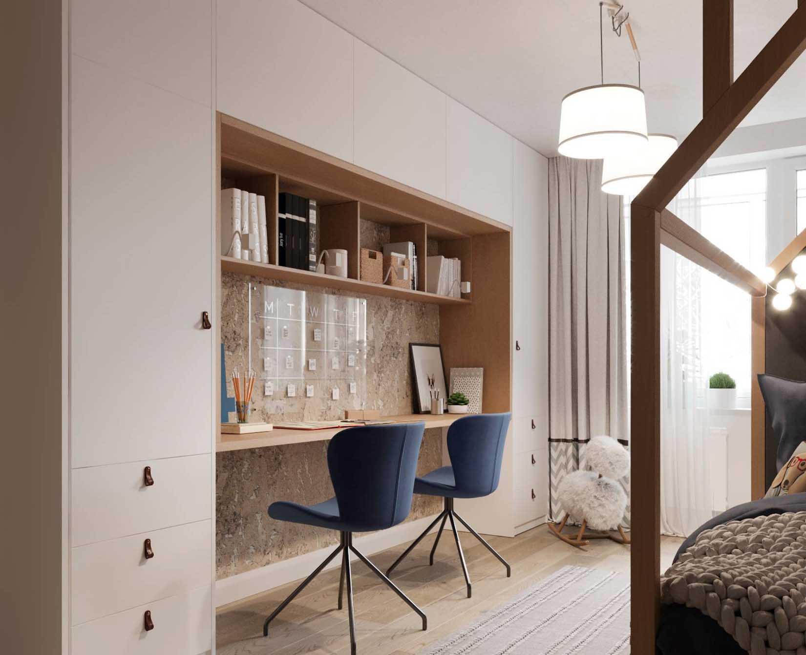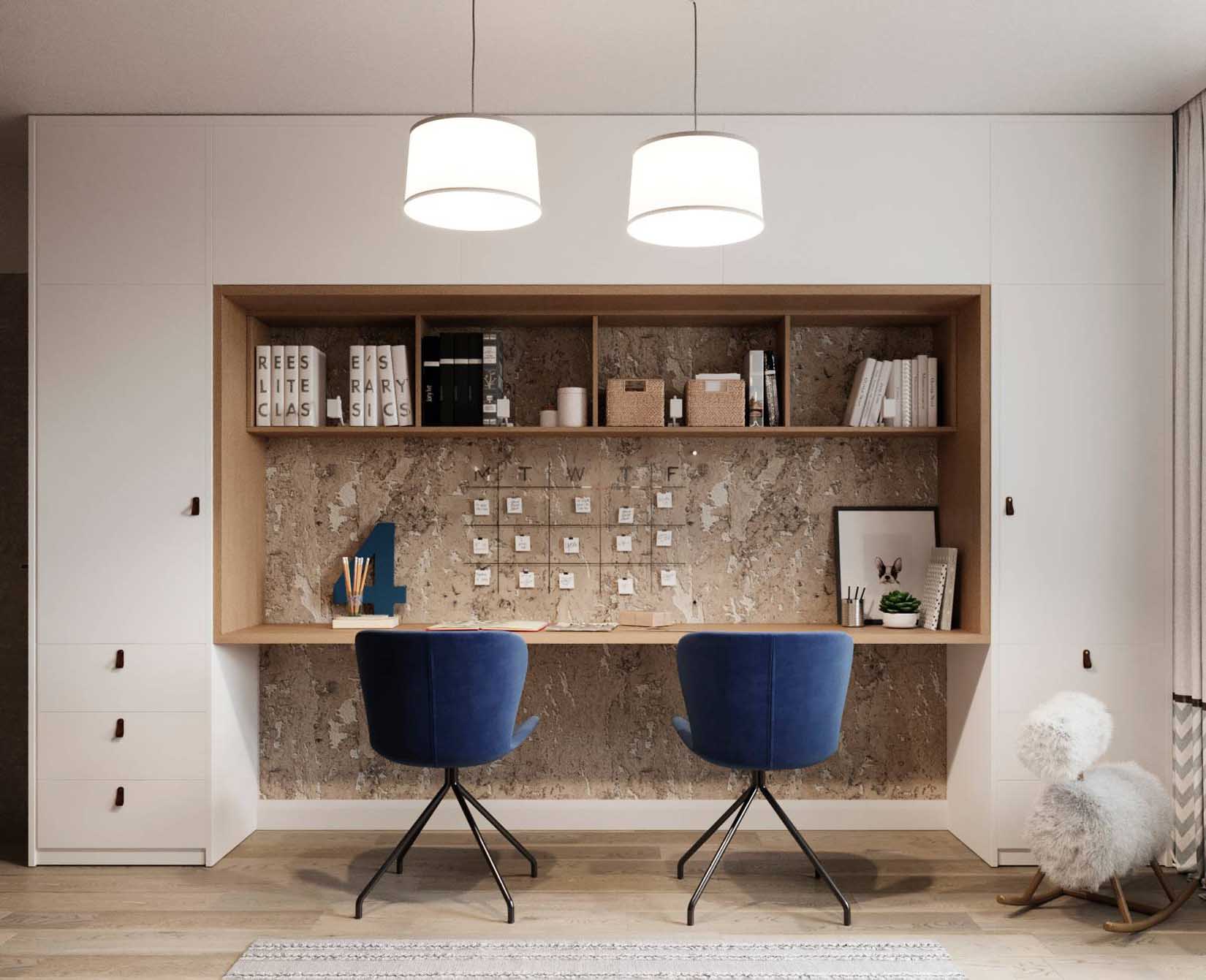 Iskolás korú gyermekeknél kritikus pont az íróasztal elhelyezése. A projektben látható megoldás egyetlen hosszú pulttal oldja meg két gyermek kényelmes elhelyezését. A falra szerelt, nyitott polcrendszer és a bútorba integrált világítás biztosítja, hogy minden eszköz kéznél legyen, de ne foglaljon el értékes helyet az asztallapon. A parafa hátfal pedig nemcsak védi a falat, hanem lehetőséget ad jegyzetek, rajzok kitűzésére is.
