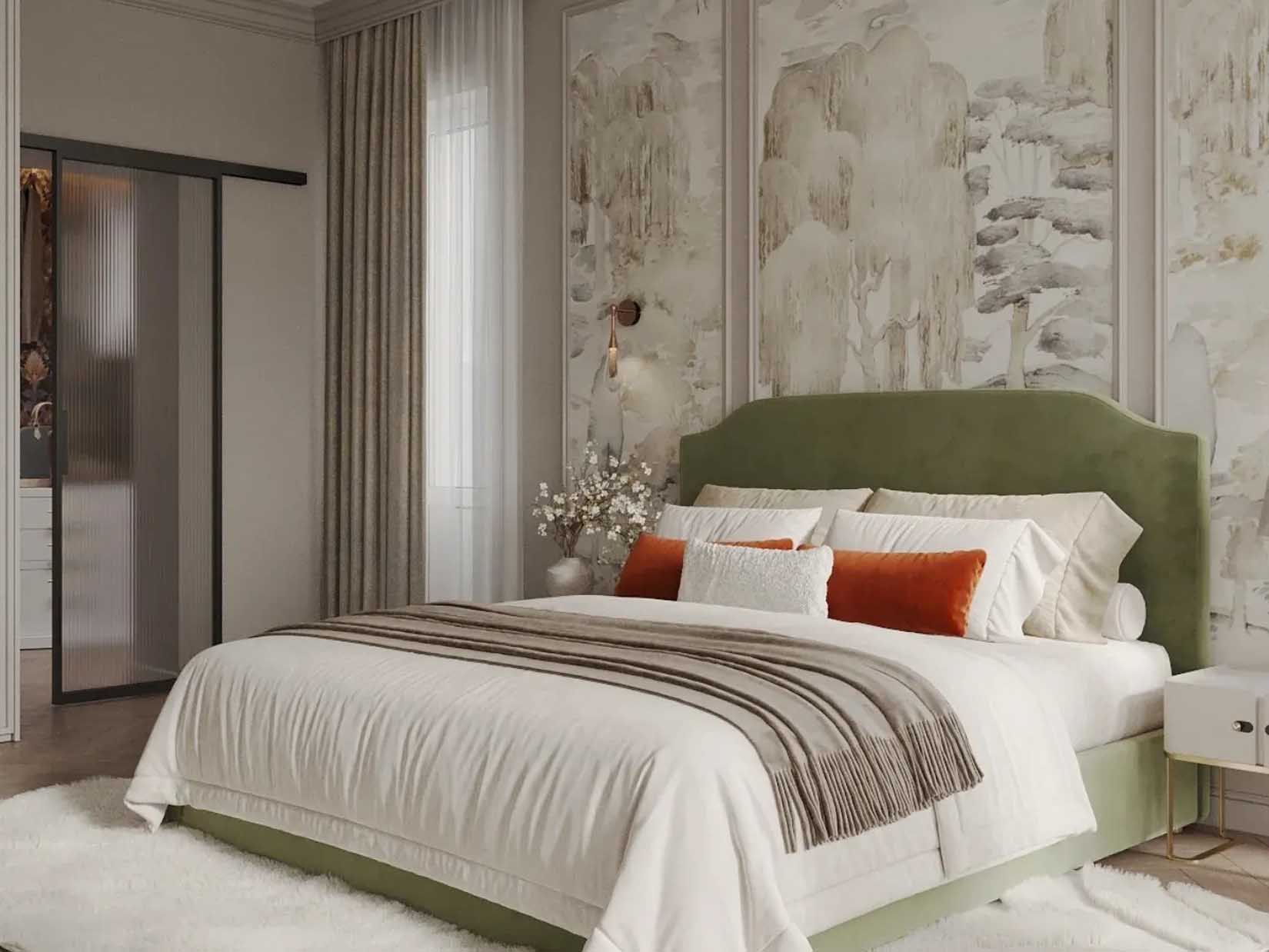 A legmarkánsabb elem az ágy mögötti fal tagolt tapétamezője: a növényi, ligetszerű motívumokkal dolgozó minta egyszerre lírai és karakteres. A tervezői szándék szerint ez a „grafikus hatású” liget a nyugalom, otthonosság és egy leheletnyi rejtély érzetét hozza, miközben mélységet ad az enteriőrnek. Fontos, hogy a tapéta itt klasszikus keretezésű mezőkbe rendezve jelenik meg, ami kifejezetten modern klasszikus megoldás: díszít, de fegyelmezetten.